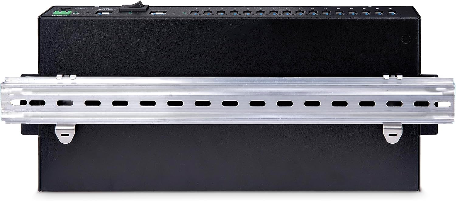 The 16-Port Industrial USB 5Gbps hub with 5Gbps of shared bandwidth features a 2-port host switch, enabling users to switch between two host devices. This USB hub is built for industrial environments. It features a rugged steel housing. It is equipped with Level-4 ESD protection, with 15kV air and 8kV contact discharge ratings. This also enables the hub to be used for daisy chaining to connect multiple Hubs together to support more devices. The 16-Port USB Hub offers three mounting options. The 19" rackmount rails are compliant with EIA-310 standards to install into 1U of rack space. The surface mount is ideal for workstations, desks, or walls. The standard DIN-rail (Top-Hat/TH) mounting hardware is ideal for installation in industrial equipment. This USB Hub features an included 160W power adapter. Power can be inputted using the 2-wire terminal block, and optional redundant power can be connected to a separate barrel power input (12-24V). With a power source connected the hub supports USB Battery Charging Specification 1.2 (BC 1.2), enabling each port to provide up to 1.5A. This USB Hub is OS independent supporting all operating systems, including Windows, macOS, and Linux. A USB Event Monitoring utility is also available for download.
