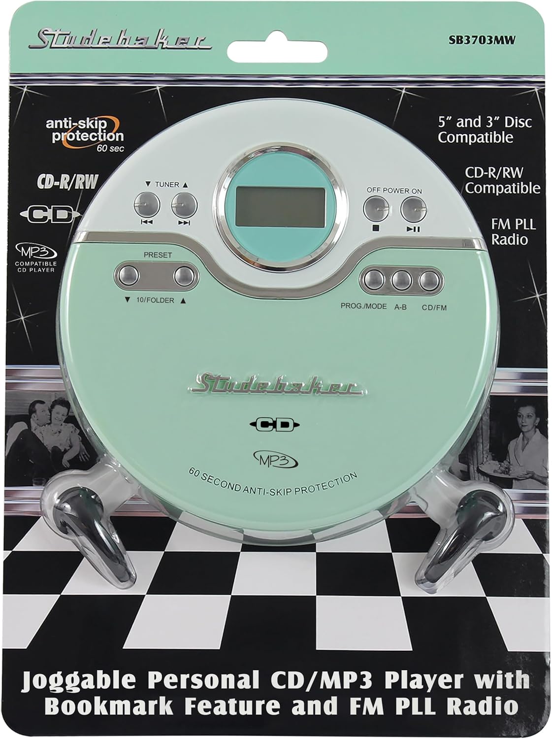 Studebaker SB3703MW Joggable Personal CD Player with FM PLL Radio includes Earbuds (Mint/White)Listen to your favorite tracks on the go with the Studebaker SB3703 personal CD player with FM radio. This compact, lightweight device comes in 3 colors. The CD player includes a headphone jack and earbuds. It features 60-second Anti-Skip protection, bass boost, digital LCD display, Skip/Search, Play/Pause, Repeat, and programmable memory. This player has a mini USB port so the unit can be powered through a computer or any other USB power source. Requires two (2) AA batteries for power (not included) for portable use.Product FeaturesFM PLL Radio60 Second Anti-skip ProtectionCD-R/RW Compatible5" & 3" Disc Compatible24 Track Programmable MemoryMulti-function, Full Digit LCD DisplayDBBS Bass Boost SwitchHeadphone JackDC Input JackMicro USB port so unit can be powered through computer or any other USB power sourceStereo Earbuds (included)Power: 2 x 'AA' (UM-3) Batteries (Not included)