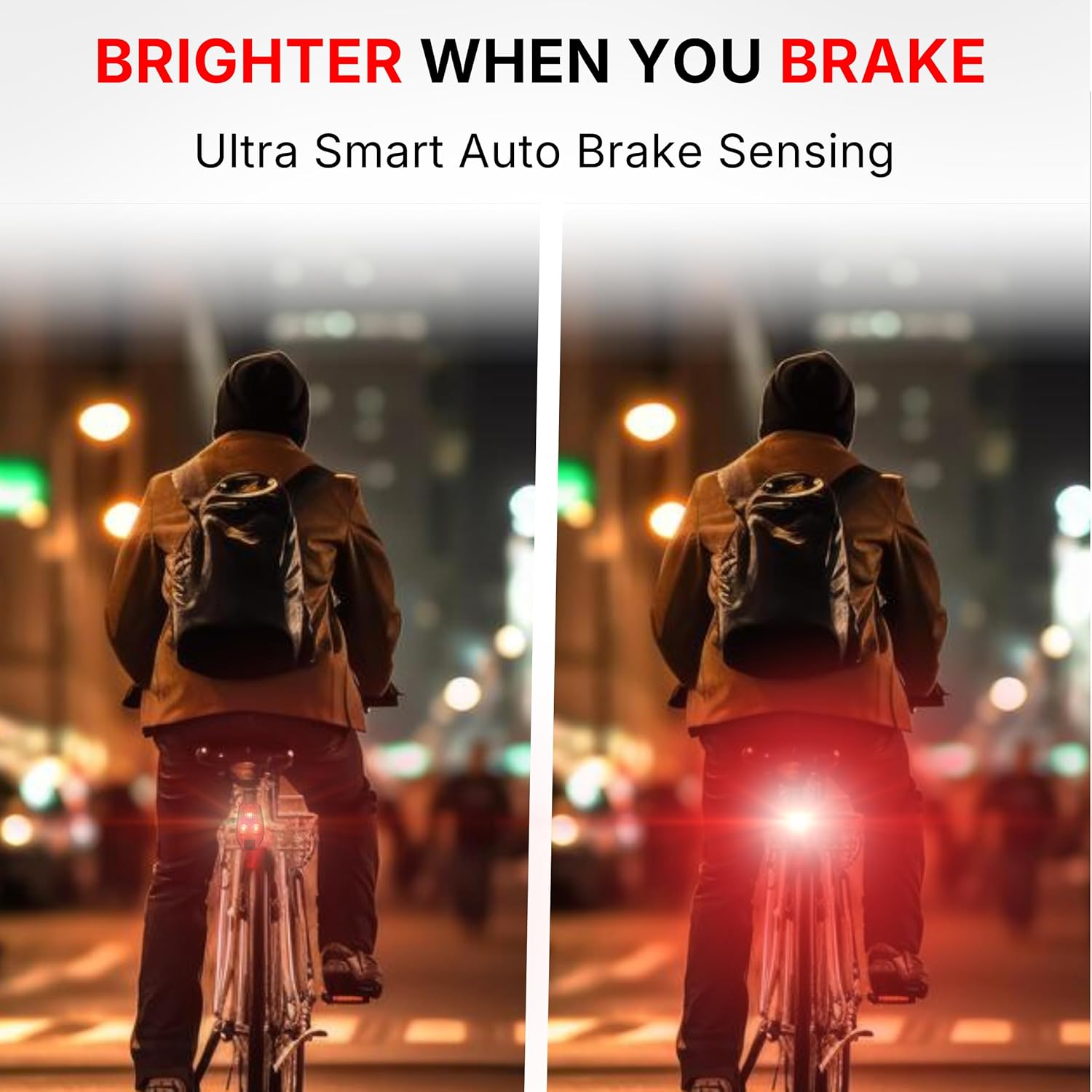 TAILGATOR Brake-Sensing Bike Tail Light is built for riders who want strong rear visibility plus a clearer signal when they slow down. A built-in accelerometer detects rapid deceleration and triggers a brighter brake burst to help traffic behind you recognize that you’re slowing—without an app, remote, or wiring.Brake sensing (expectation): The brake burst is designed to activate during rapid deceleration. Gentle slowing may not trigger the brake burst, which helps prevent constant activation and supports battery life.Quick SpecsUp to 300 lumens during brake burstFive light settings (includes non-brake modes)USB rechargeable (micro-USB) – cable includedUp to 60 hours depending on mode and braking eventsWater-resistant ABS housingSeatpost strap mountLifetime warrantyWhat’s IncludedTailgator Rear Tail Brake LightPlastic attachment deviceBand to secure to seatpostUSB charging cord (micro-USB)Instruction manualQ&AQ: Does it brake-flash every time I slow down? A: It’s designed to trigger on rapid deceleration. Gentle slowing may not activate the brake burst.Q: Where should I mount it for best brake sensing? A: Mount it on the rear of your seatpost for the most consistent brake sensing.Q: Will it work if I have a rack or seat bag? A: If your seatpost is blocked by a rack/seat bag, mounting options may be limited. If the light is not rigidly mounted and shifts, brake sensing may be less consistent.Q: Is it USB-C? A: Charging is micro-USB using the included cable.Q: How long does the battery last? A: Up to 60 hours depending on mode and how often the brake burst triggers.Q: Is it waterproof? A: It is water resistant for typical riding in rain/splashes.Q: What modes are included? A: Five modes: moderate back-and-forth flashing, fast back-and-forth flashing, pulsing/strobe, steady flash (no braking action), and steady dim (no braking action).Q: What if it stops working? A: It is backed by a lifetime warranty.