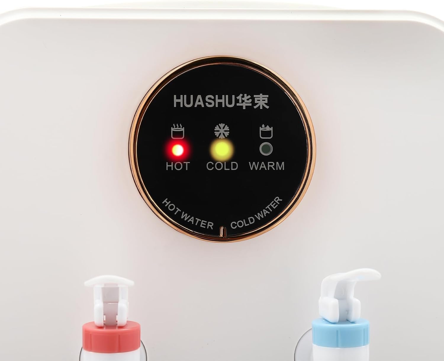 DetailsLED Indicator: It can display the working status of the product, allowing you to see whether the product is turned on or off, as well as whether it is heated or cooled. Cold and Hot Water Indication: The product surface has instructions for cold and hot water, and the hot water faucet is highlighted in pink to avoid scalding due to incorrect use.Vents: The back vent effectively dissipates heat, avoiding overheating during product operation.SpecificationMaterial: Plastic and Stainless Steel Color: WhiteShape: RectangleAssembly Required: NoNumber of Items: 1Tank Capacity: 500ml/0.13galWater Temperature Type: Hot/Cold/Constant Temper Water Applicable Bucket Capacity: 4.5-18.9L/1.19-4.99galHeating Time: About 4-8 MinutesCooling Time: About 40 MinutesModel: HS-WJVoltage: 110VRated Frequency: 60HZInput Power: 575WHeating Power: 500WCooling Power: 75WHot Water: ≥90°C/194°FCold Water: ≥15°C/59°FRelative Humidity: ≤90%The Environment Temperature: 10°C-38°C/50°F-100.4°FGross Weight: 2.6kg/5.73lbsTotal Length of Power Cord: 1.3m/4.27ftTotal Width of the Product (Including the Faucet): 28.5cm/11.22inProduct Size: 25.5*25*37cm/10.04*9.84*14.56inPackage Size: 29*28*41cm/11.42*11.02*16.14inPackage Included1* Water Dispenser1*English ManualNotes1.Please note that the bucket is not included.2.Before plugging in, please make sure the water bottle is settled on the machine, and make sure the water comes out of the hot water faucet, otherwise it may damage the hot water tank. 3.To prevent dry burning of the water dispenser, after each power outage or long-term use, please add a glass of room temperature water before starting to add boiling water. (Ensure that there is normal temperature water in the water pipe to avoid directly boiling water to the water pipe)4.If water does not come out of the faucet, gently shake the machine or tap the water bottle to expel air from the inner tube.