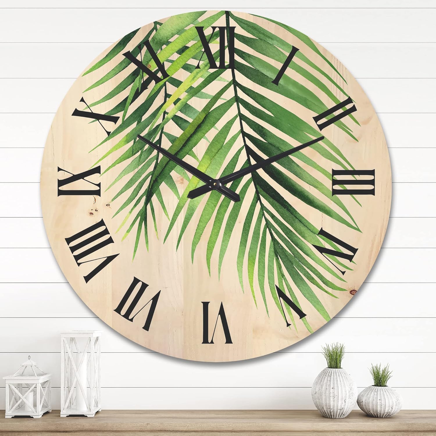 This original Tropical round wood wall clock fits in both in rustic decors as well as contemporary spaces. The woodgrain detailing surfaces slightly through the colors of the design, adding to authentic wood character of your artwork wood clock. The Tropical Palm Branches fine art is directly printed on the wood using superior quality 6 Color UV ink, providing an impressive and unique design for your office or home in modern as well as traditional interiors. The natural grain varieties of each panel of wood creates a truly original round wall clock making it the focal point of every room. Features - Style: Tropical Type: Wood Wall Art, Fine Art, Wood Fine Art, Print on Plaque - Using the highest quality ink which will not fade over time. - Arrives ready to hang on the wall with hanging kit included - Material: Made with 100% natural pine wood. - Number of Pieces: 1 - Size: Medium, Large, Small - Color: Green - Country of Origin: Canada - "AA" battery included with your order. - Easy to hang. See Options drop down for available sizes.