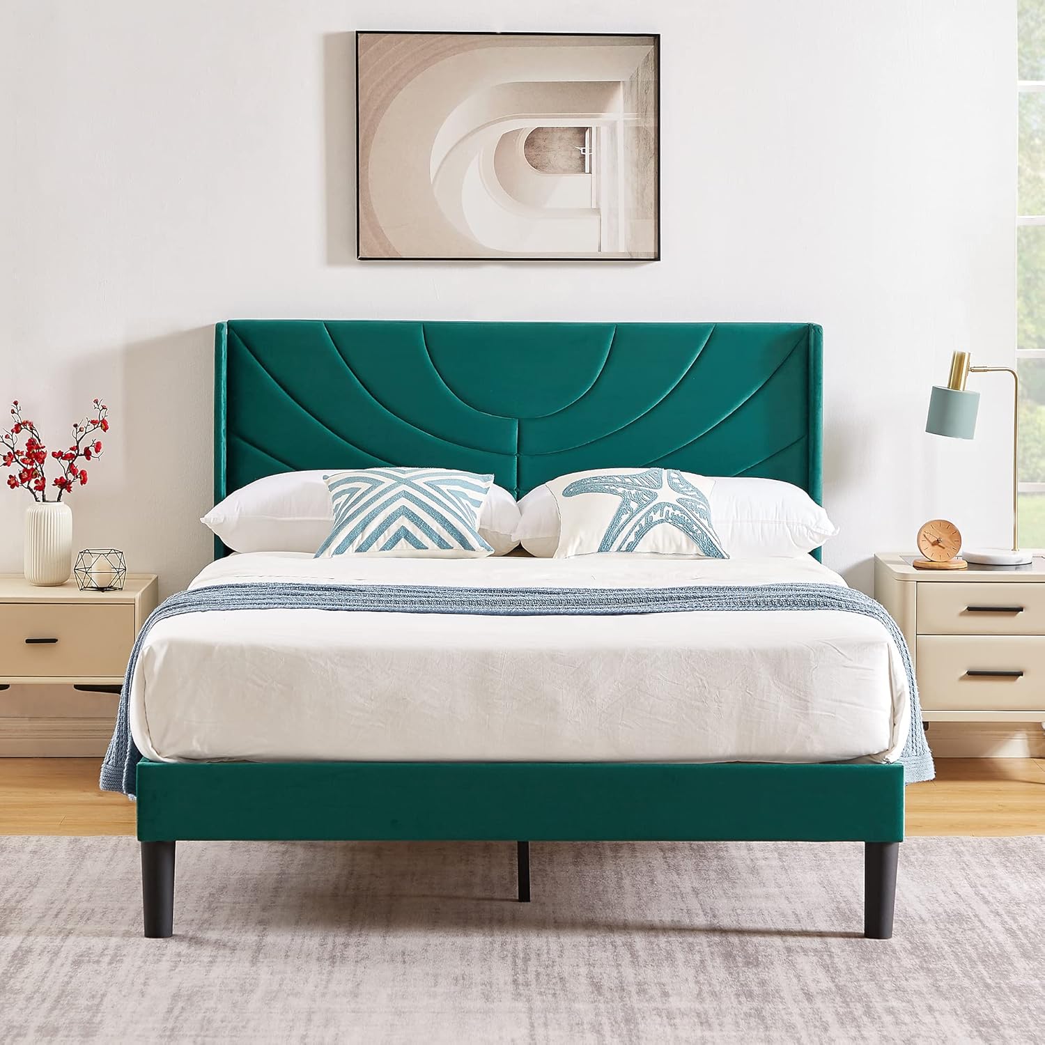 VECELO Upholstered Bed frame&Headboard, You Definitely Deserved It!What are our advantages?NO Box Spring NeededNO Squeak14 in under bed clearanceEnhanced Metal LegsExcellent Customer-ServiceCost Effective (Price Advantage)Specifications:VELELO Upholstered Bed frame&HeadboardBed Frame Color: Dark GreenStyle: WaveMax Load: 500 lb(Twin), 600 lb(Full), 800 lb(Queen)Package Includes: 1 x Bed Frame 1 x Upholstered Headboard1 x Instruction1 x Assembly KitTips:Do not tighten screws until fully assembled. Make sure the legs remain in contact with the ground.Mattress is not includedCheck all screws or bolts are tightened and inspected regularly.