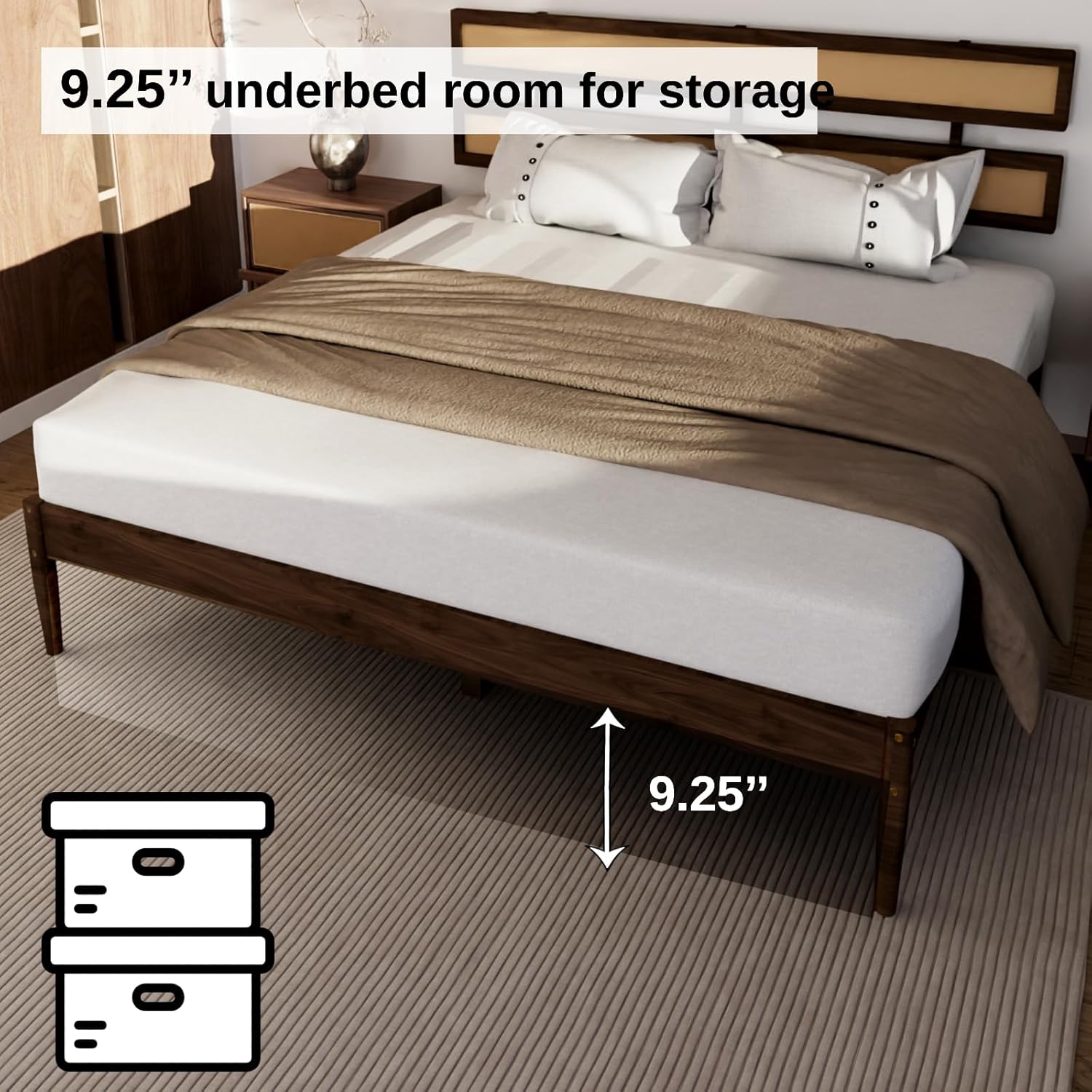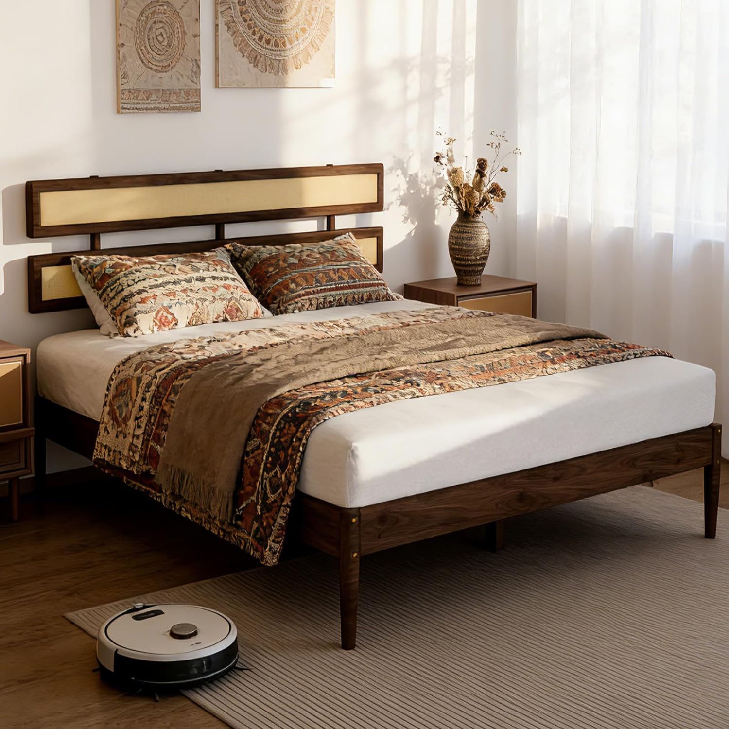 Experience the perfect fusion of authentic retro aesthetics and modern functionality with this solid wood bed frame. Its boho inspired design — highlighted by sleek lines, tapered legs, and a warm walnut finish — adds timeless character to any room.Crafted from premium solid wood, the rattan bed offers exceptional strength, noise-free performance, and long-term durability. The slatted base eliminates the need for a box spring, while promoting airflow to extend the life of your mattress.Ideal for small bedrooms, guest rooms, or minimalist interiors, this modern platform bed brings together classic design and everyday innovation. It’s not just a bed — it’s a statement piece that merges mid-century beauty with modern convenience, creating a restful and stylish retreat.