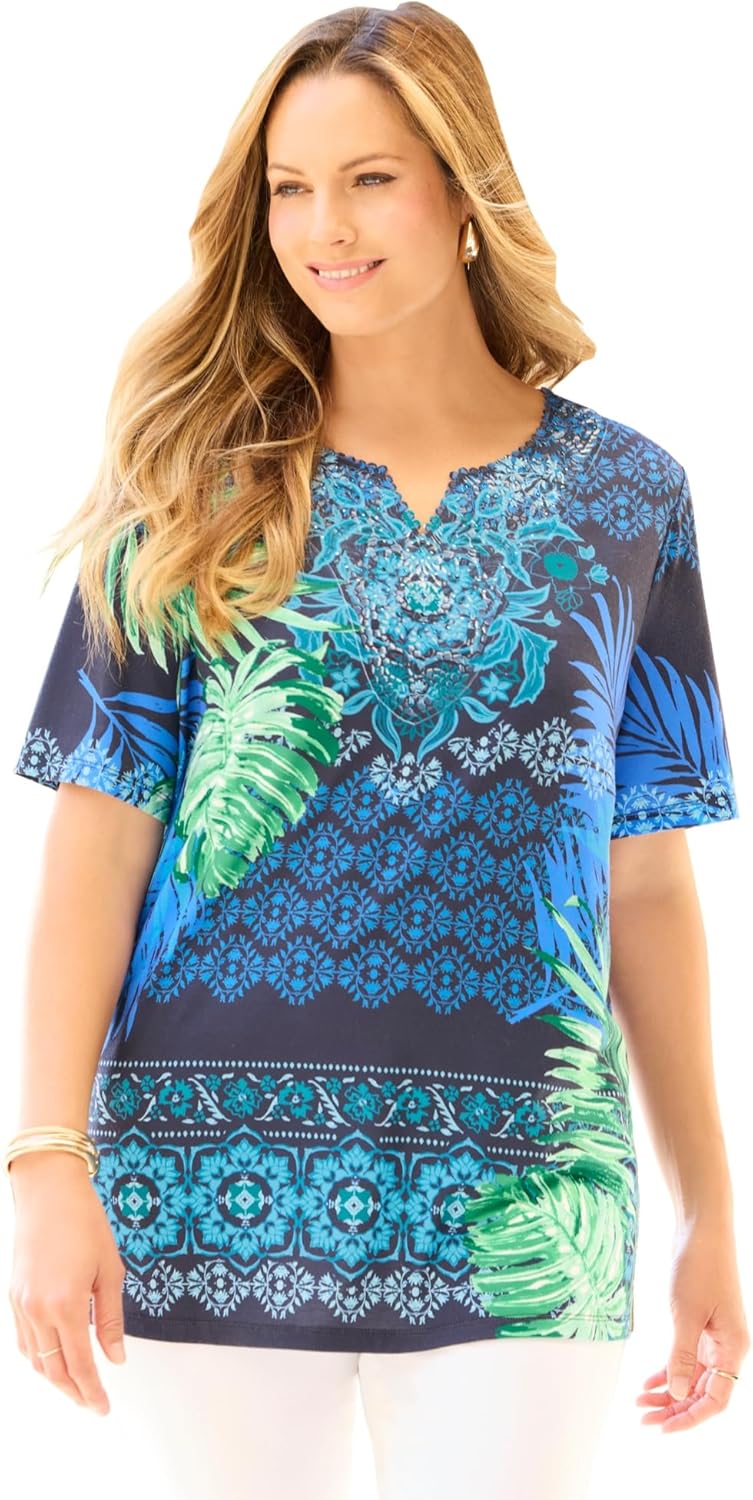 The contrasting print of this top is all about eye-catching style that can have you fashionably dressed for day or night. The neckline is embellished with charming crochet and sparkling studs for extra feminine flair.FABRIC: Super-soft and smooth knit with comfortable stretch.FIT: Relaxed, easy silhouette. Notched neck. Short sleeves. 95% Polyester, 5% Spandexbr>Machine Washbr>Imported Plus Size Topbr>Front Length (On Body): Regular 31" and Petite 29"br>Plus Sizes 0X-6X, Petite Plus Sizes 0XWP-3XWPbr>Catherines