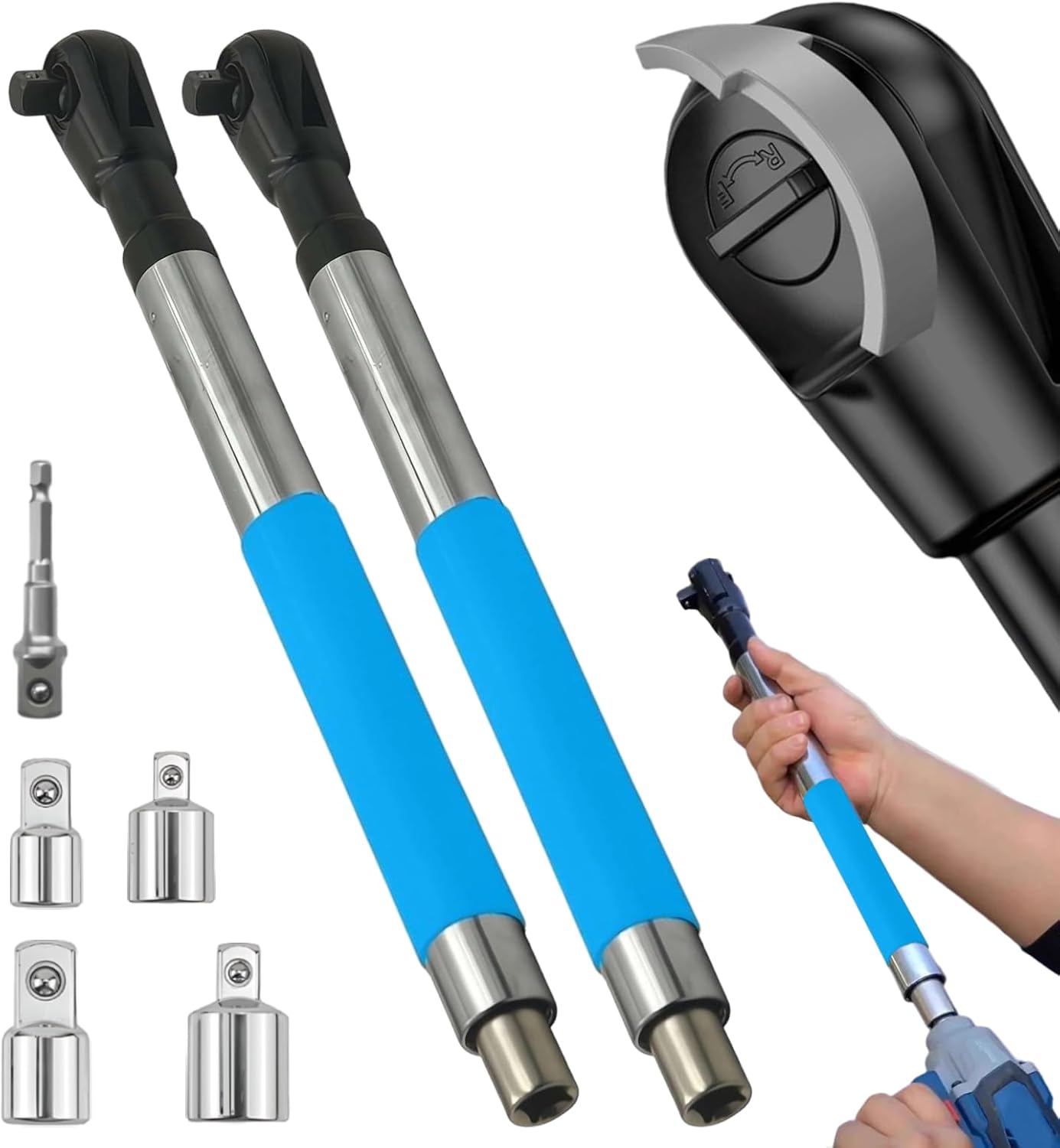 Wrench Extender, Offset Extension Wrench, Offset Extension Wrench Impact, Electric Ratchet Wrench,Chain Drive Wrench Extender with 4 Socket and 1/2‘’ Electric Drill Adapters for Labor-Saving(1x Blue)