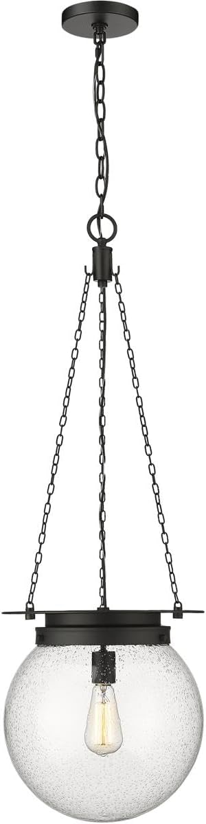 Calhoun 13" Wide Pendant Product Specifications: SKU: 7506P13-MB Finish: Matte Black Manufactured By: Z-Lite Canopy Depth: 5.125 in. Canopy Width: 5.125 in. Chain length: 72 in. Depth: 13 in. Height: 14.75 in. Maximum Height: 86.75 in. Minimum Height: 17.75 in. Nominal Width: 13 in. Pendant Size: Full Sized Product Weight: 8 Width: 13 in. Wire Length: 110 Bulb Included: No Shade: Yes Bulb Base: Medium (E26) Bulb Shape: A19 Bulb Visible: Yes Characteristics: Shaded Dimmable: Yes Fixture Shape: Bowl Glass Features: Seedy Glass Hanging Options: Chains Light Direction: Down Lighting Material: Steel Number of Bulbs: 1 Number of Light Source(s): 1 Pendant Type: Single Pendant Shade Color: Clear Shade Material: Glass Shade Shape: Bowl Sloped Ceiling Compatible: Yes Theme: Transitional Power Source: Hardwired Voltage: 120 Voltage Type: Line Voltage (110-120V) Wattage: 60 Watts Per Bulb: 60 Certifications: ETL Collection: Calhoun Country Of Origin: China Energy Star: No Location Rating: Dry Location Manufacturer Warranty: 1 Year Limited