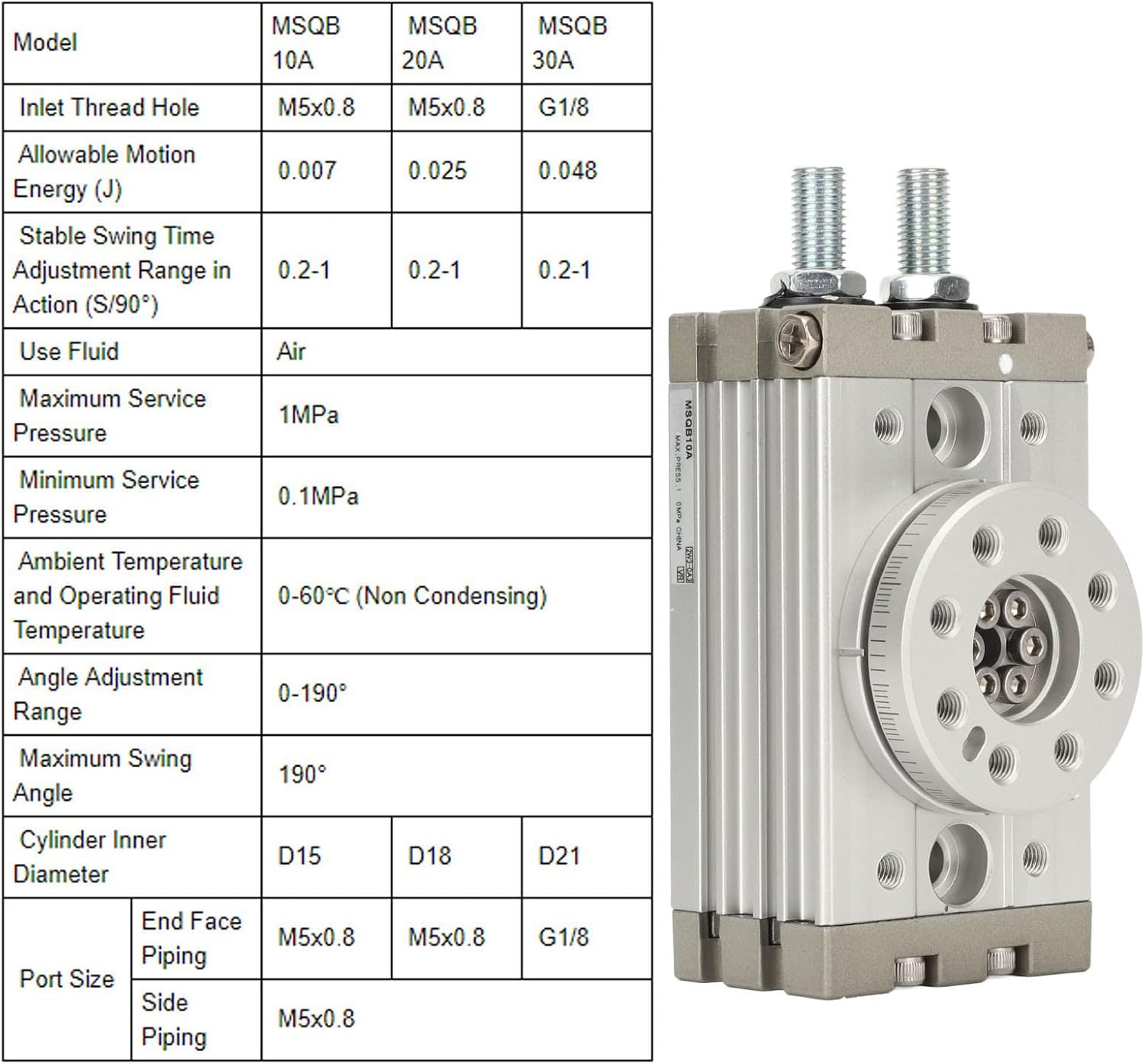 1. [Angle Adjustable] The rotating cylinder uses an angle adjustment unit and can be adjusted from 0 to 190 degrees, the is smooth and accurate. 2. [Design Feature] Built-in magnetic ring, can be installed with magnetic switch. The cylinder is double-acting, air supply from both sides of the piston and output force in one or two directions. 3. [Made of Aluminum Alloy] The cylinder is made of aluminum alloy, which is sturdy, hard to corrode and rust, can work normally in high and low temperature environment. 4. [Large Output Force] The air cylinder is designed with roller bearing, with a large output force, the sealing performance will automatically improve with the increase of pressure. 5. [Wide Application] The cylinder is widely used in automation equipment in light industry, chemical industry, textile, electronics, machinery and other industries. Specification: Material: aluminium alloy. Model MSQB 10A MSQB 20A MSQB 30A Inlet Thread Hole M5x0.8 M5x0.8 G1/8 Allowed Motion Energy (J) 0.007 0.025 0.048 Time adjustment range of stable in action (S/90°) 0.2-1 0.2-1 0.2-1 Use fluid air Maximum service pressure 1MPa Minimum service pressure 0.1MPa Ambient temperature and operating fluid temperature 0-60°C (non-condensing) Angle adjustment range 0-190° Max angle 190° Cylinder Inner Diameter D15 D18 D21 Connection Size End Face Pipe M5x0.8 M5x0.8 G1/8 Side Pipe M5x0.8 Packing List: 1 x Rotary Pneumatic Air Cylinder