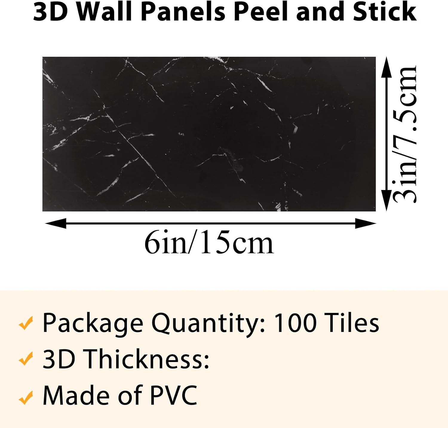 LISHINE 100 Sheet 3" x 6" Peel and Stick Backsplash, Waterproof Wall Tiles Stick on Backsplash for Kitchen, Bathroom, Laundry Room, Camper, Fireplace Feature: 100 pieces 3"x6" peel and stick tile backsplash, cover about 12.08 square feet. These stick on tile are made from premium adhesive material, these tiles offer a secure and long-lasting bond to surfaces, ensuring stability and endurance over time. Resistant to humidity and heat. Peel and stick wall tiles are engineered to withstand moisture, they are perfectly suited for damp environments such as kitchen counters, bathroom walls and so on. Black peel and stick tile are used in kitchen island walls, bathroom backsplashes, shower, laundry rooms,living room etc. Refresh your space with these peel and stick backsplash tiles. Featuring a sleek look and easy application, they come in various patterns to suit different styles.Specification: Material: PVC Size: 3" x 6" Color: Black Package Included: 100 x Peel and Stick Tile Backsplash