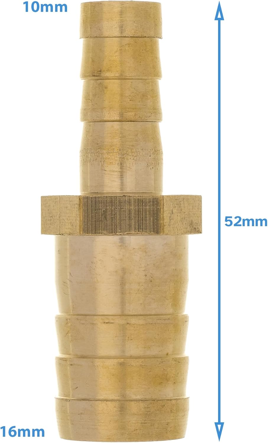 Details 1pc Barbed Fitting Material: Brass Colour: Brass Approximate Dimensions Barb Size: 16mm To 10mm Total Length: 52mm