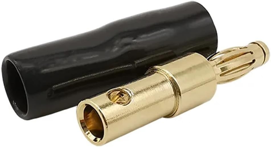 Speaker Wire ConnectorsName: 4mm Banana ConnectorColor: Red, Black, GoldGender: MaleBody Material: BrassBody length: Appr. 31.70mmScrew type connector, no need solderingPackage: 4Pcs = 2Pcs Red + 2Pcs Black