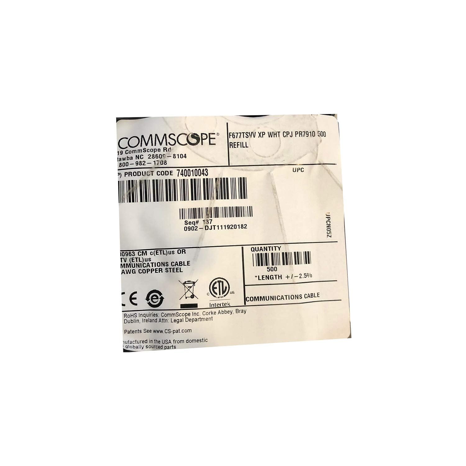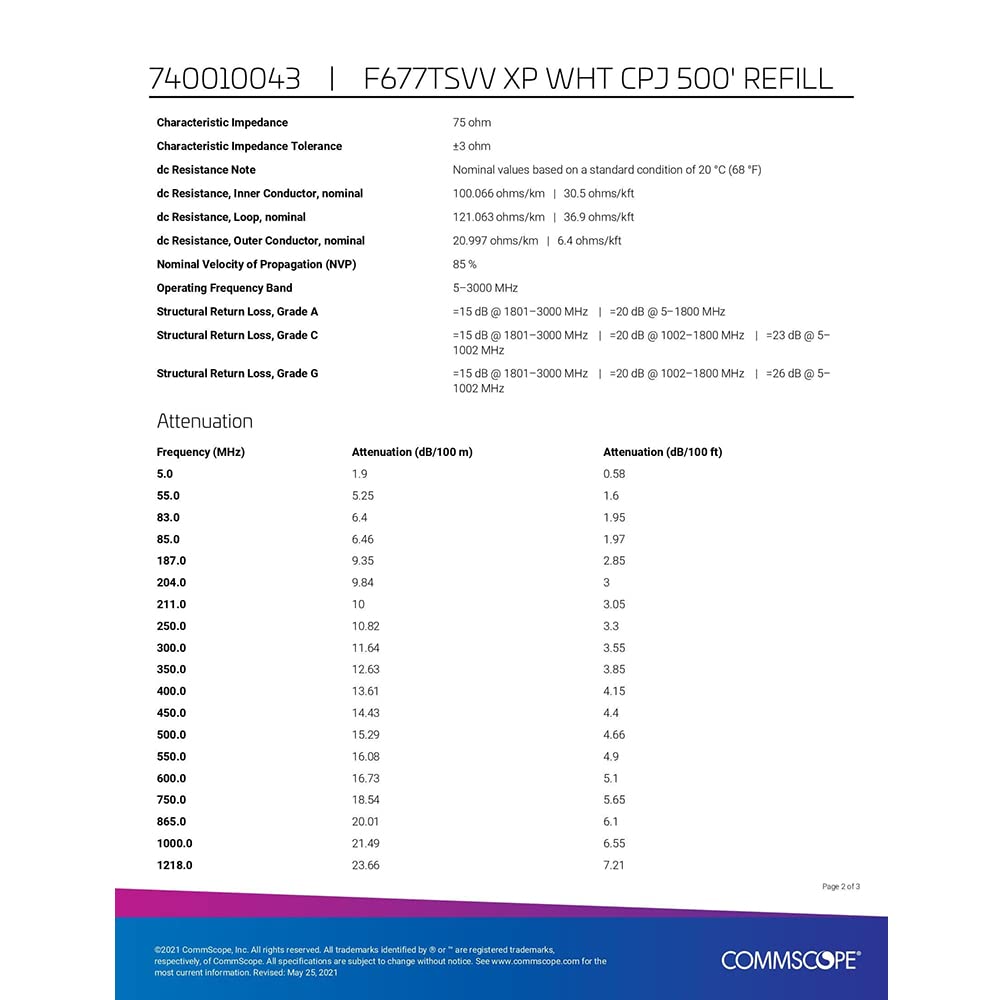 Product: Coaxial drop cableLength: 500 FeetColor: White The item listed for sale is a 500 foot roll of coaxial cable preferred by telecommunications and security installers. Common usage includes cable and satellite television, CCTV cameras, audio, and video installations. This high quality communications cable manufactured in the United States by Commscope, a multi-national telecommunications and network infrastructure provider based in North Carolina. SpecificationsCable Type: Series 6Packaging Type: CoilShield Construction Type: Tri-shieldCenter Conductor Gauge: 18 AWGCenter Conductor Type: SolidWarranty: One year