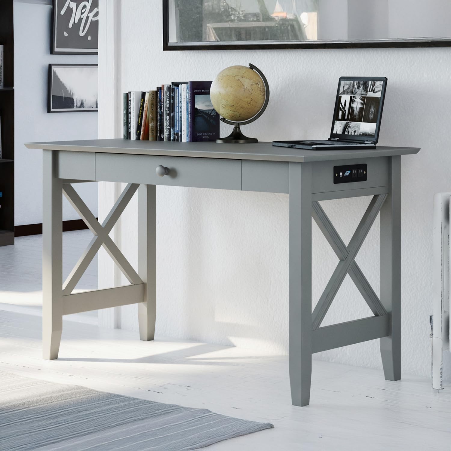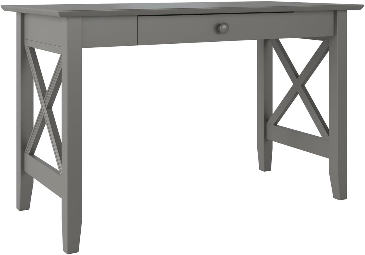 Ample study space and a drawer to store supplies are the hallmarks of our functional and fashionable Lexi Desk. The distinctive crossed design will make your office the focal point of your home. As durable as they are chic, this desk is manufactured using sustainably sourced solid hardwood. The perfect addition to any home office or study space, this desk offers a large work area that comfortably accommodates a laptop or desktop, along with a spacious storage drawer for all of your other work essentials. This desk also includes a built-in charging station for all of your favorite devices!
