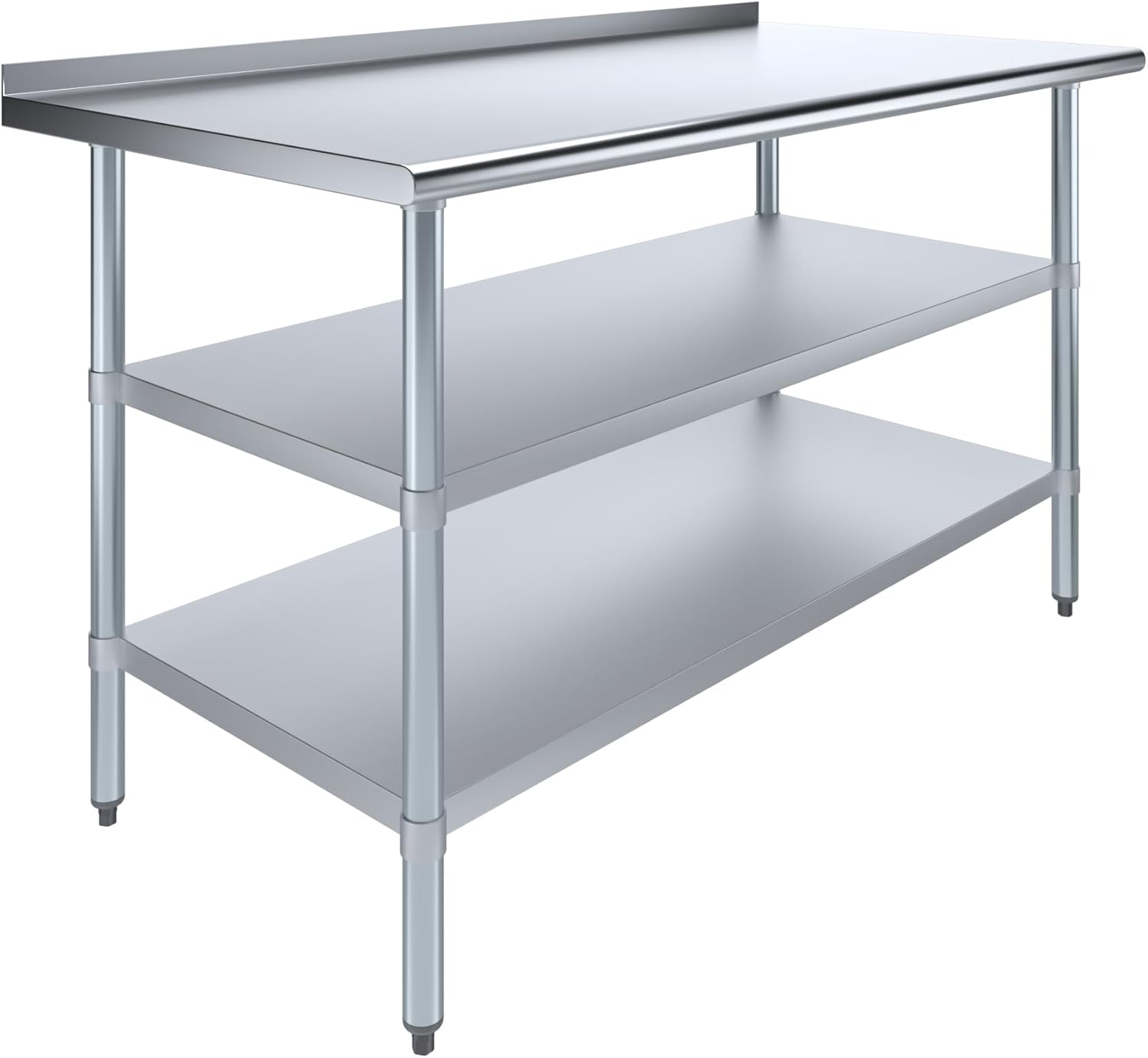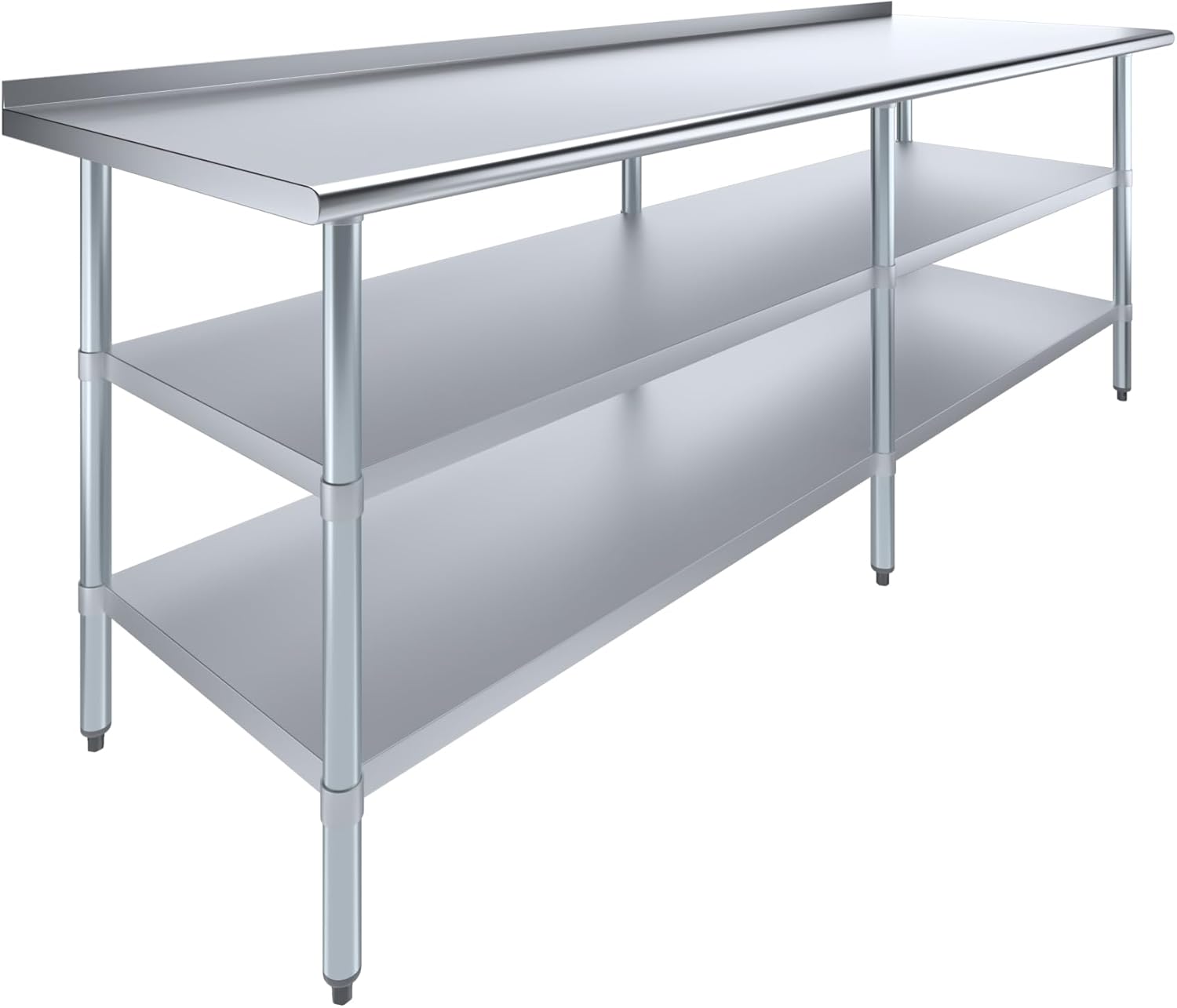 Stainless Steel Work Table With Backsplash and Two Galvanized UndershelvesCommon Applications:Food Prep Table For Commercial KitchenKitchen IslandCounter ExtensionUtility Bench for ShopProfessional Work StationGarage Work BenchLaundry Clothes Folding TableBrewing SetupExam Table For VeterinariansButcher ShopProduct SpecificationsStainless steel work table surface has curved edges for safety and comfort. It incorporates two heavy-duty adjustable galvanized bottom shelves and leveling feet.18 Gauge 430 Stainless Steel TopTwo Galvanized Adjustable Bottom ShelvesAdjustable feet to compensate for uneven floorHeight: 35"NSF CertifiedSturdy & easy to setupHeavy Duty