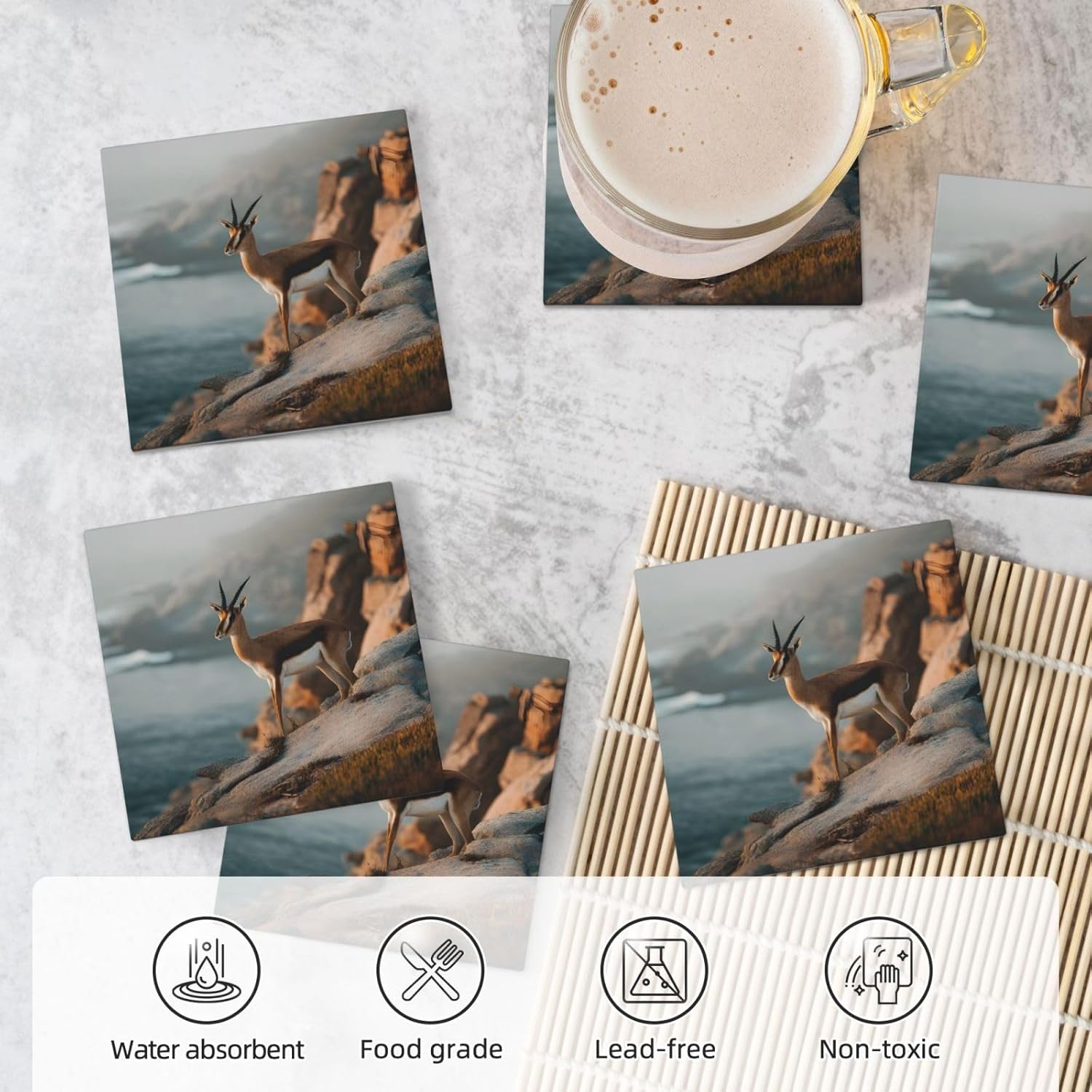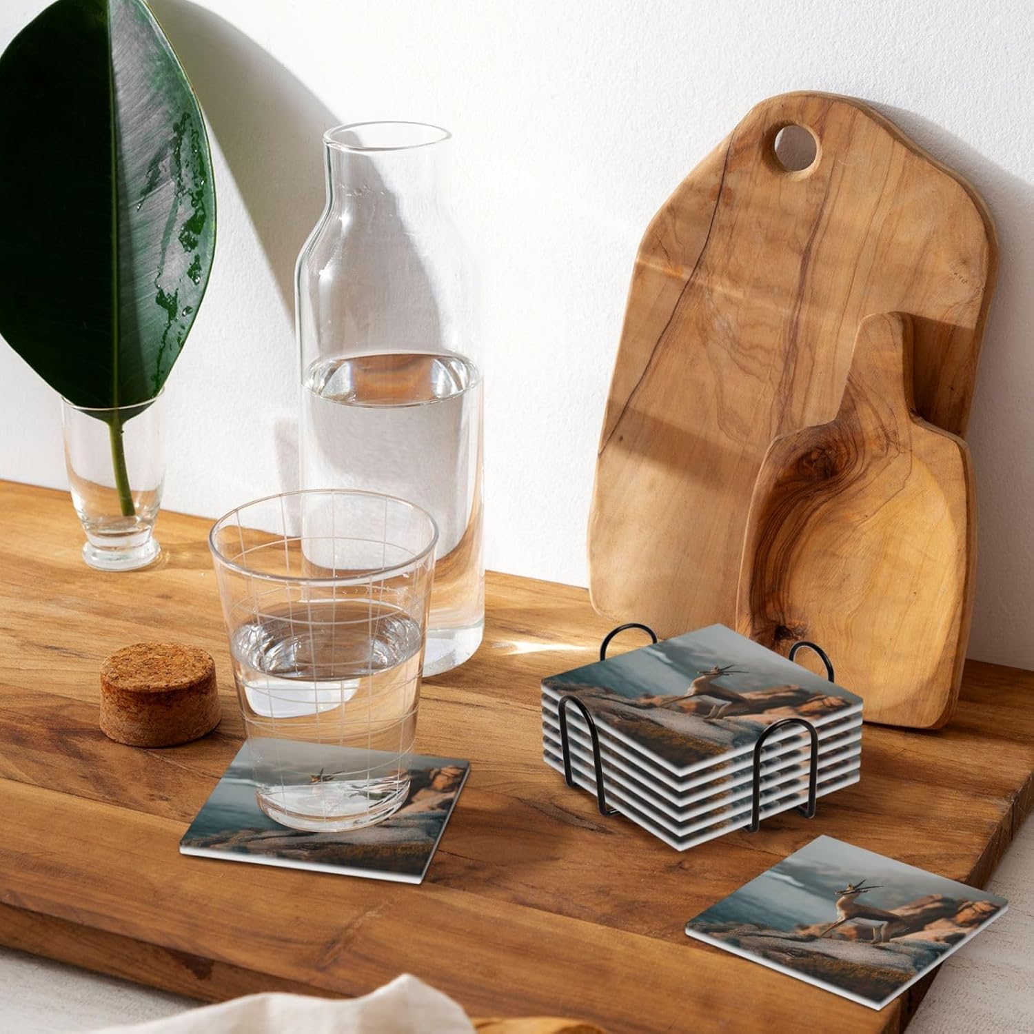 Product Name: DCEHGEW Ceramic Drink CoastersMaterial Type: Ceramic with cork bottomSize: Round: 4.1 x 4.1 inches, Square: 3.9 x 3.9 inches, Hexagon: 4.3 x 3.7 inchesPattern: Antelope About Our Ceramic Absorbent Coasters:Product Features - Crafted from high-quality ceramic, these coasters are odorless and eco-friendly. Their superior absorbency keeps your surfaces dry by quickly soaking up spills from coffee, cola, and other beverages within 10-15 seconds.Applicable Scenarios - Perfect for adding a stylish touch to your kitchen, living room, bar, hotel, or restaurant. These coasters are an ideal present for birthdays, Mother's Day, Father's Day, Valentine's Day, anniversaries, housewarming celebrations, or Christmas.Accessory Structure - Each set includes 6 ceramic coasters with cork bottoms, accompanied by a sleek black metal stand for organized and aesthetic storage. Choose from three different shapes to suit your style and needs.Washing Instructions - Easily clean these coasters with water or a damp cloth.Special NoteDue to different measurement methods, a deviation of up to 0.3 cm in size is considered normal.Please Note:The product images are for reference only. Actual products may vary slightly due to production factors such as batch differences and machine settings. Minor variations in color, position, and size are normal and not considered defects. Thank you for your understanding!Customer Service:We want to make sure you have an amazing experience with us. Please contact us with any feedback you may have. We love to hear from you and usually respond within 12-24 hours.