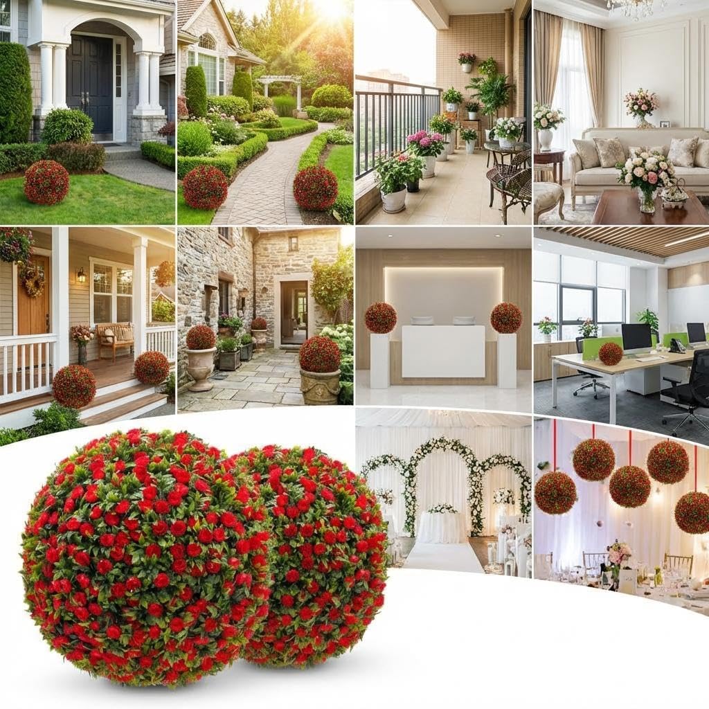 Elevate Your Spaces with Our Realistic Artificial Topiary BallsTransform your living or outdoor areas with our exquisitely crafted Artificial Topiary Balls. These stunning decorative pieces combine timeless elegance with modern durability, creating the perfect accent for any setting. Each set includes two meticulously designed topiary balls that bring sophistication and natural beauty to your home, garden, or special event.Premium Construction & Lasting Beauty Manufactured from upgraded premium PE material, our topiary balls are built to withstand the elements while maintaining their vibrant colors and realistic appearance. Unlike natural plants that require constant care, these artificial beauties remain lush and colorful through sun, rain, and changing seasons without fading or withering. The realistic leaf texture and natural color variations create an authentic garden atmosphere that will impress your guests and enhance your curb appeal.Versatile Decor Solutions Whether you're decorating your front porch, enhancing your garden landscape, or preparing for a special celebration, these topiary balls offer endless possibilities:Outdoor Excellence: Perfect for entranceways, patios, walkways, courtyards, and poolside areasIndoor Elegance: Ideal for living rooms, offices, reception areas, balconies, and dining spacesSpecial Events: Create memorable wedding decorations, party atmospheres, and holiday displaysCustomizable to Your Needs Available in four sophisticated colors (White, Pink, Red, Yellow) and multiple diameters (16", 17", 18", 22"), you can mix and match to create your perfect decorative arrangement. The white topiary balls offer classic elegance, pink brings romantic charm, red makes a bold statement, and yellow adds cheerful vibrancy to any space.