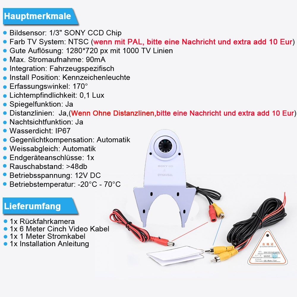This product could fit for all below models as expected:Transporter Mercedes Benz Sprinter Viano Vito Transit Ducato VW Crafter T5 Master Mercedes Benz: Transporter Citan Sprinter Vario Viano Vito Citroen: Berlingo Jumper Jumpy Nemo Dacia: Dokker Van Fiat: Cargo Doblo Ducato Fiorino Scudo Strada Ford: Tourneo Transit/Transit Connect Hyundai: H1 Isuzu: D-Max Iveco: Daily Eurocargo Mitsubishi: Canter L200 Nissan: Navara Opel: Combo Movano Vivaro Peugeot: Bipper Boxer Expert Partner Renault: Master Seat: Inca Skoda: Felicia Praktik Roomste Toyota: Hilux Hiace VW: Amarok Caddy Crafter T5 Master Dachkamera/bremslicht/bremsleuchte/brake lamp Technique Parameter:1. TV system: NTSC (if you need PAL, please leave a message)2. Resolution: 480/520 TV lines3. Lens angle:170°4. S/N ratio: more than 48db(AGC-OFF)5. Video Color: Colorful6. Video Output: 1.0Vp-p,75Ω7. Image Device: 1/4 inch color8. Sensing area: 5.78 x 4.19mm9. Sync. system: internal10.Power supply: DC 12V11,White Balance: Auto12.Waterproof Class: ip 6613.Effective pixels: 628 x 586 Pixels14.Electronic Shutter: 1/60-1/10000 seconds15.Current Consumption: ≤150mA16.Current consumption: 90mA Max17.Storage temperature:-40°C to +60°C, RH95% Max18.Minimum illumination:0.3Lux/F1.219.Operating Temperature:-30°C to +50°C, RH95%Package Content: 1 x Car CCD Camera1 x 6M video cable1 x 1M power cable1 x User Manual