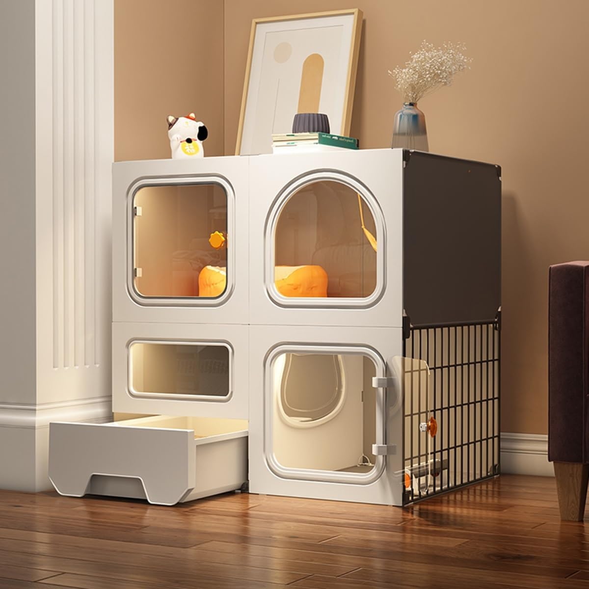 - Cat cage x 1- Cat litter box x 1- Cat litter shovel x 1(Note: Other accessories shown in the picture are not included)Important notes:1. Both sides of the transparent plastic plate have a protective film that needs to be removed before installation.2. Assembling the cat cage may take some time. If you have limited hands-on skills, please make your purchase carefully.