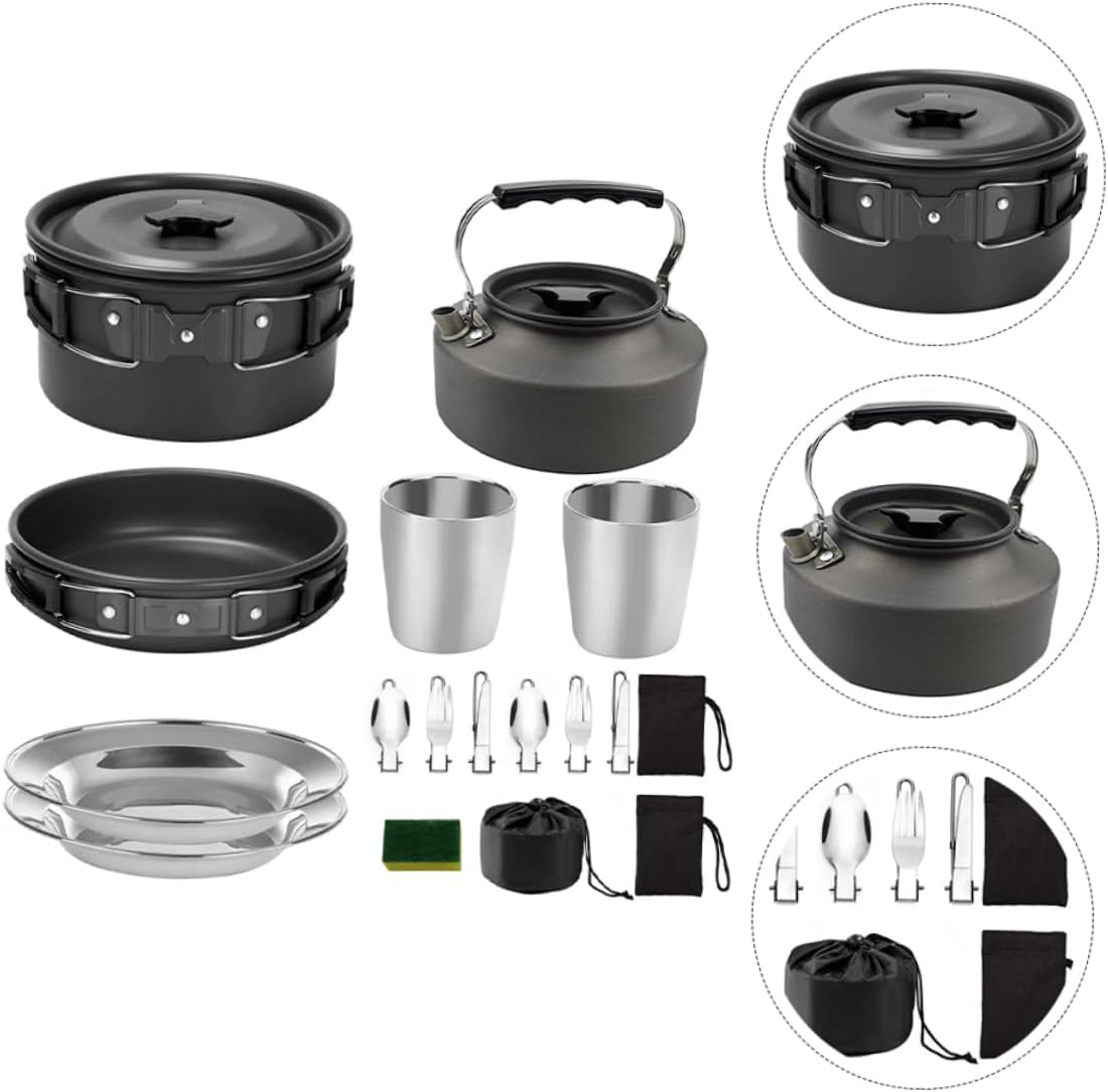Package List 1 x pot 1 x frying pan 1 x teapot 1 x spoon 1 x fork 1 x table-cutlery 3 x bowls 1 x soup spoon 1 x buckle 1 x brush 1 x wood spoon Features -Size: About 18.00X18.00X12.50cm/7.07X7.07X4.91in. camping cookware -Color: Assorted Color. outdoor cooking set -Material: Aluminium alloy camping cookware set. - Made of alumina material, and easy to clean Camping Cooking Accessories. - The camping cookware comes equipped with all of your kitchen essentials, offering an for boiling water and cooking food outdoors. camping cooking tool equipment - Multi function, for camping, hunting, hiking, backpacking or other outdoor occasions outdoor cooking kit. - Exquisite workmanship make this cookware set to or deform Camping Cookware Kit. - Light weight for indoor and outdoor supplies cookware for camping.Goods InformationCamping Cooking Accessories It's fully loaded with all the features you need for transport, assembly and cooking, this set of cookware has been carefully designed to make your camping experience more fun and convenient.Camping Cookware Kit This item is manufactured with for durable and long-lasting use