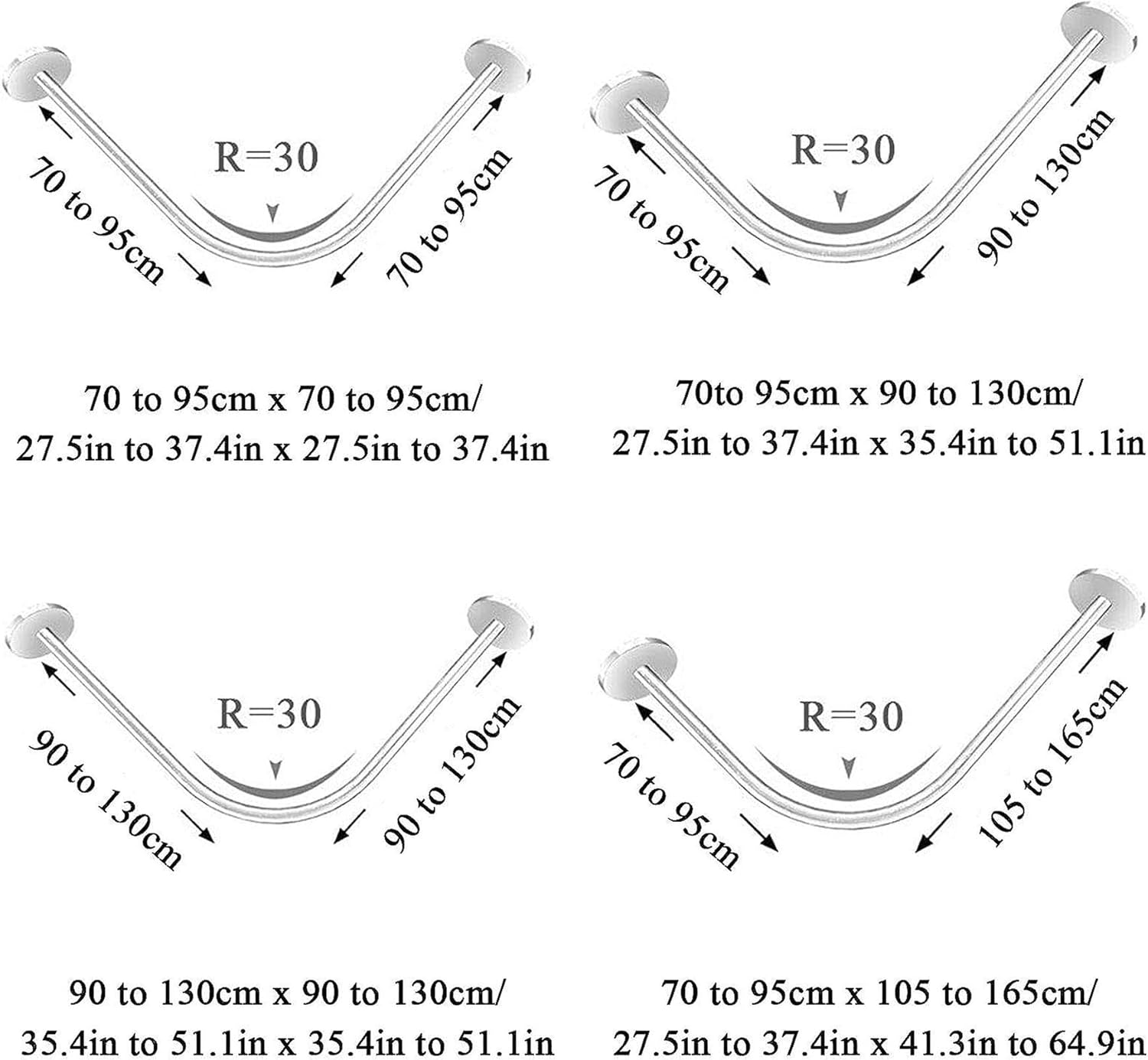 Stretchable Corner Shower Curtain Rod - Drill Free Install 304 Stainless L Shaped for Bathroom, Clothing Store★The shower curtain rod can provide you with a more comfortable shower experience★We have designed a variety of sizes to help you find the ideal rod to meet your different requirements★There is no need to drill the L-shaped shower curtain rod to avoid noise and damage the wall. It can easily adapt to various walls★The shower curtain rod is made of high-quality thick 304 stainless steel, never rust, corrosion resistance, not easy to deform, and strong bearing capacity★Applicable places: bathroom, kitchen, toilet, closet, cloakroom, dressing room, etc.4 retractable sizes:70-95cm*70-95cm (29.5-37.4inch*29.5-37.4inch)70-95cm*90-130cm (29.5-37.4inch*35.4-51.1inch)90-130cm*90-130cm (35.4-51.1inch*35.4-51.1inch)70-95cm*105-165cm (29.5-37.4inch*41.3-65inch)Packing: 1 Telescopic Shower Curtain Rail + Shower Curtain(Random)+ set of hooks, installation accessories, (for customs reasons, glue is not included)prompt:1. Before using the product, please measure the required size before making a selection2. If you have questions and doubts while using the product, please feel free to contact us by email We will help you solve the problems and doubts