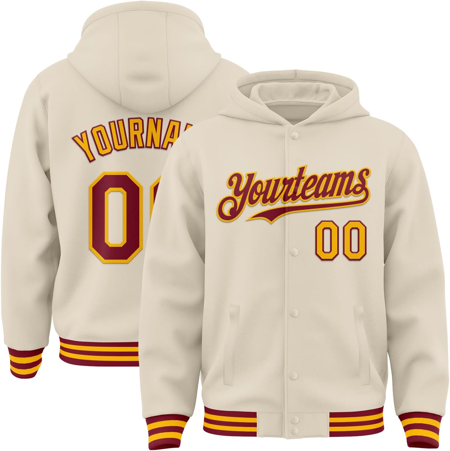 Custom Baseball Hoodie Jacket Varsity Letterman Jackets Personalized Stitched Name Number Logo Embroidered Letterman Bomber Jacket with Hood Full Snap Polyester & Leather Sleeve Cotton Blend Warm Winter Windbreaker Lightweight Sports Bomber Sweatshirts Jacket Coats for Men Women Youth Boys Girls With our hooded varsity jackets, you have the freedom to choose the colors, fonts, and styles that reflect your personality. Every detail is carefully crafted, from the letter patches to the ribbed cuffs and collar, to deliver a timeless and classic look. How to customized your personalized hooded varsity letterman jacket? Step 1: Choose the color that you want, click The "Customize Now "button; Step 2: Please choose your the size, sleeve and inside lining types of you want; Step 3: Enter your name or player name, number and the Logo that you wanna design; Step 4: An unique customized baseball hoodie jacket you want finished. Specifications: ✔*Material: 100% Poly Wool ✔*Embroidered Craft: Stitched Team Player Names, Numbers, and Logo ✔*Two Types of Inside Lining Material: Lightweight & Quilted Warm Fabric Lining ✔*Two Types of Sleeve Material: Poly Wool & Leather ✔*Full Snap Front ✔*Baseball Jacket with Hood Design ✔*Two Front Pockets & Two Interior Slip Pocket ✔*Rib-knit Elastic Cuffs & Waistband: Soft And Comfortable ✔*Exquisite Stitching, Fresh and Washable ✔* Machine Washable & Hand Washable, Please Don't Bleach, Tumble Dry Low(Natural Air Drying Recommended) Whether you're a student athlete, a sports enthusiast, or simply looking to add a touch of nostalgia to your wardrobe, our built varsity letterman jacket is the perfect choice. Note: All sizes are US sizes, please check carefully before placing an order. The colors may exist slight difference due to different screens.