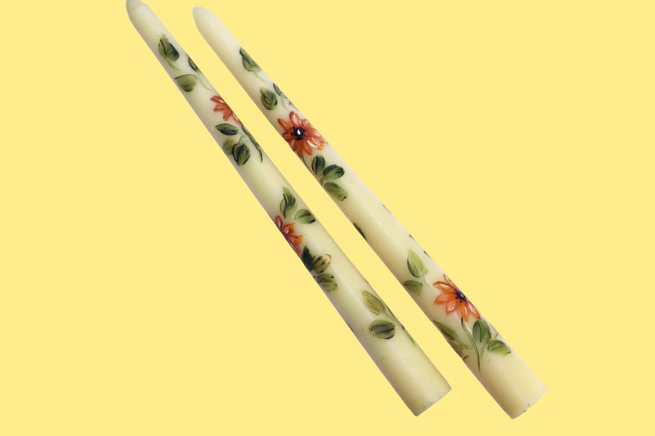 Add floral Boho style to your home with these pretty ivory tapers featuring hand-painted sunflowers with golden-green leaves all along the length of each candle! It's a pair that will add artful, flowery charm to your kitchen or dining room table! And the unscented candles are dripless and smokeless, so they burn cleanly! Buy a pair or two for yourself or gift them to someone special...they make wonderful and unique housewarming/hostess gifts! Set of Two Unscented Taper Candles, 10" high, 3/4" at base