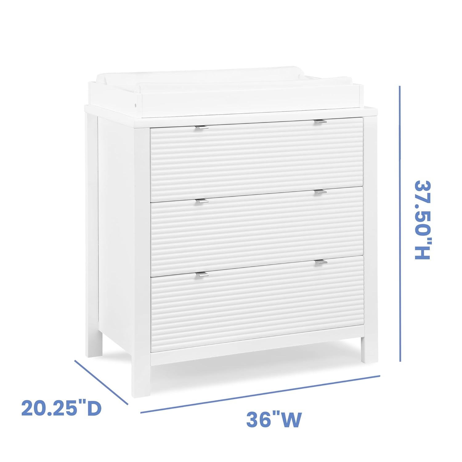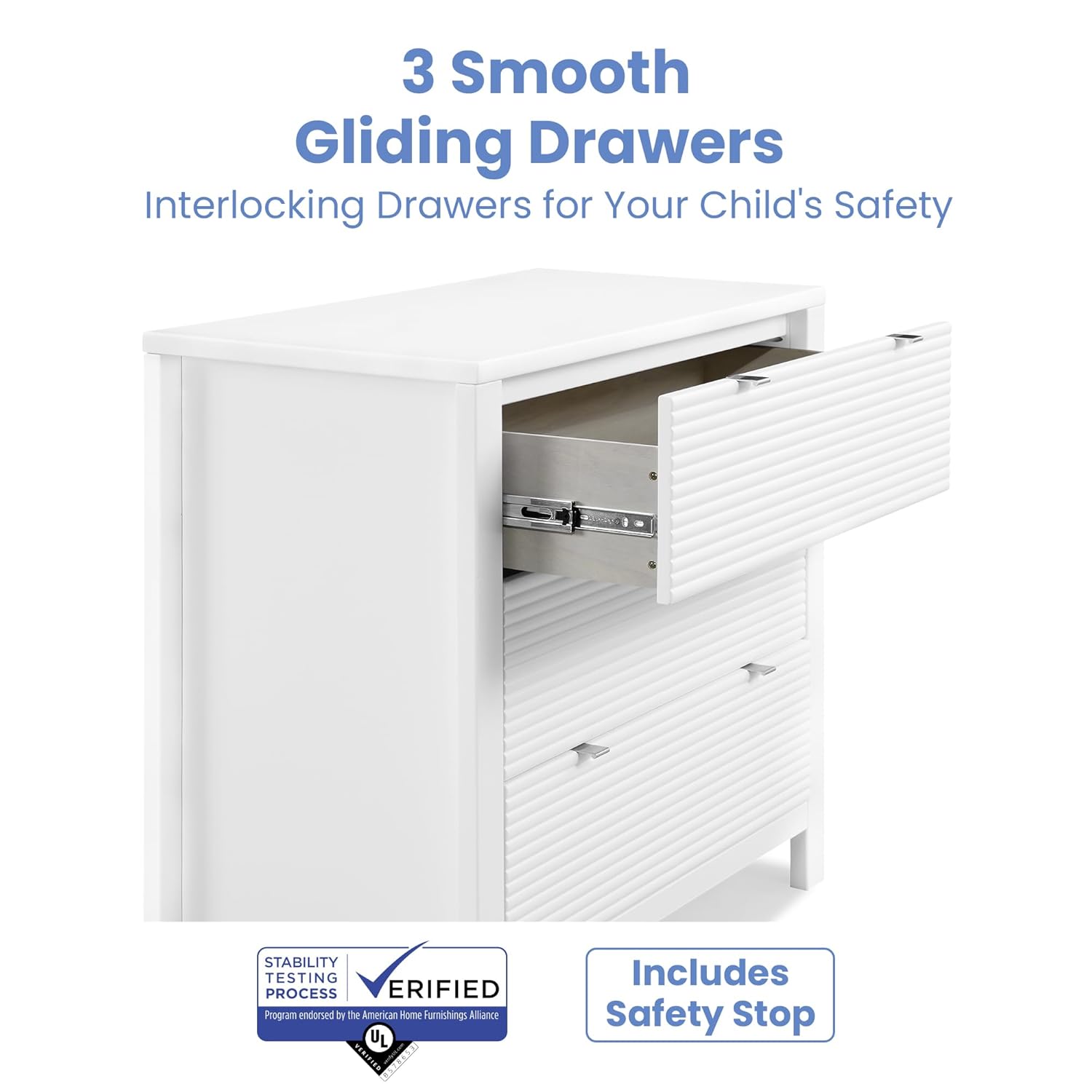 Complete their bedroom with the Cassie 3 Drawer Dresser with Changing Top by Delta Children With three roomy drawers and a modern design that features fluted drawer fonts capped with chrome pulls, there's room for everything. This spacious storage piece serves as a sturdy changing table too, with the included changing topper (changing pad sold separately). When your child grows, just remove the topper, it easily transitions into a stand-alone dresser. This dresser also features a durable construction made from sustainable woods like New Zealand pine and interlocking drawers that only allow one drawer to be opened at any time for your child’s safety. Available in Bianca White, Midnight Gray and Lilac. Pair this dresser with the Cassie 4-in-1 Convertible Crib to complete your space. All Delta Children dressers and chests are UL Stability Verified, tested to ASTM F2057 Furniture Safety Standard, the voluntary industry tip over standard for dressers. For your children's safety, only purchase dressers that comply with this standard. For additional security, Delta Children strongly recommends that all dressers in your home be anchored; all Delta dressers include a wall anchor. To learn how to properly secure your dresser, please see the product assembly instructions or visit our website.