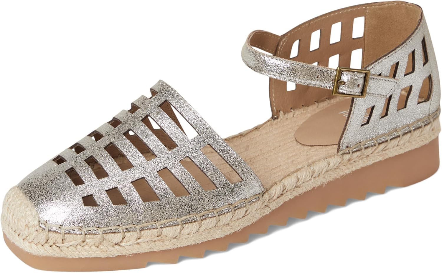 Unique summer espadrille with jute wrapped midsole and rubber bottom. Upper has cute cut outs and a mary jane strap with buckle to ensure fit.