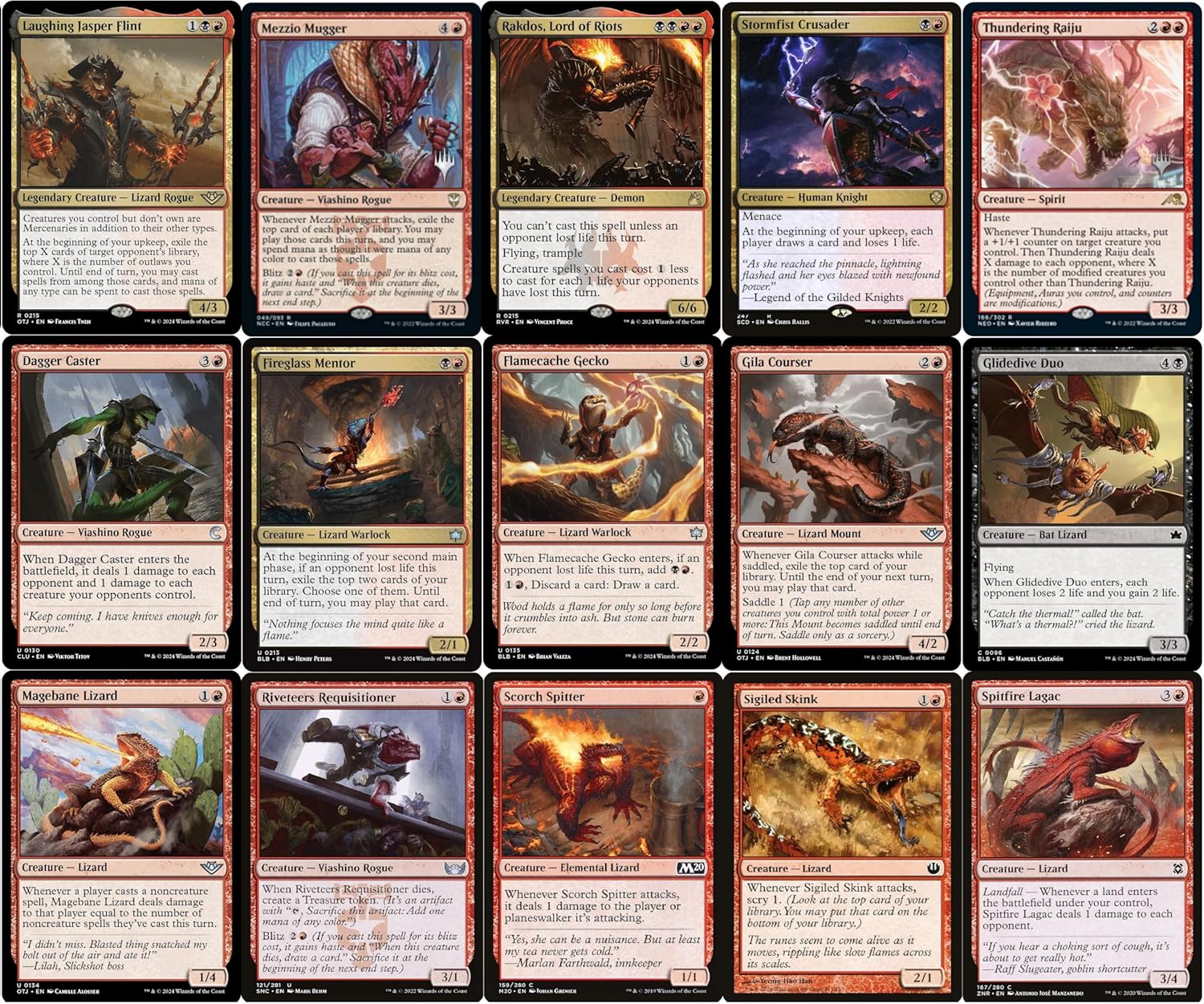 This deck is an absolute blast to play. The deck is highly aggressive with the goal of quickly burning down your opponents. The deck combines Gev's powerful ability to add +1/+1 counters to numerous burn effects to quickly play out a massive army of strong creatures and aggressively attack your opponents. The deck starts by quickly casting Gev. The deck then adds a huge number of spells and abilities that cause all opponents to lose life, allowing Gev's +1/+1 ability to triple-trigger. Creatures/spells causing direct damage or life loss are numerous including Hearthborn Battler, Iridescent Vinelasher, Stormfist Crusader, End the Festivities, Flame Rift, and many more. The deck then adds a huge number of efficiently-costed creatures with strong secondary abilities, which can easily enter with 3 +1/+1 counters when Gev triggers. These include cards such as Hellspur Posse Boss (haste, creature tokens), Hired Claw (burn, +1/+1 counters), Laughing Jasper Flint (steal opponent spells), Mezzio Mugger (steal spells), Rakdos, Lord of Riots (acceleration), Stormfist Crusader (card draw/drain), Thundering Raiju (+1/+1 counters, direct damage), etc. Finally, the deck features a number of strong acceleration spells to cast your army ahead of curve, and powerful removal spells to deal with your opponents' strongest threats. This is an incredibly aggressive deck that can quickly deal massive damage. This deck is PERFECT for anyone looking to play a fun, new, themed deck. This deck is remarkably powerful and features a number of powerful creatures and synergies. This deck has been play tested and is strong, not to mention a ton of fun to play!