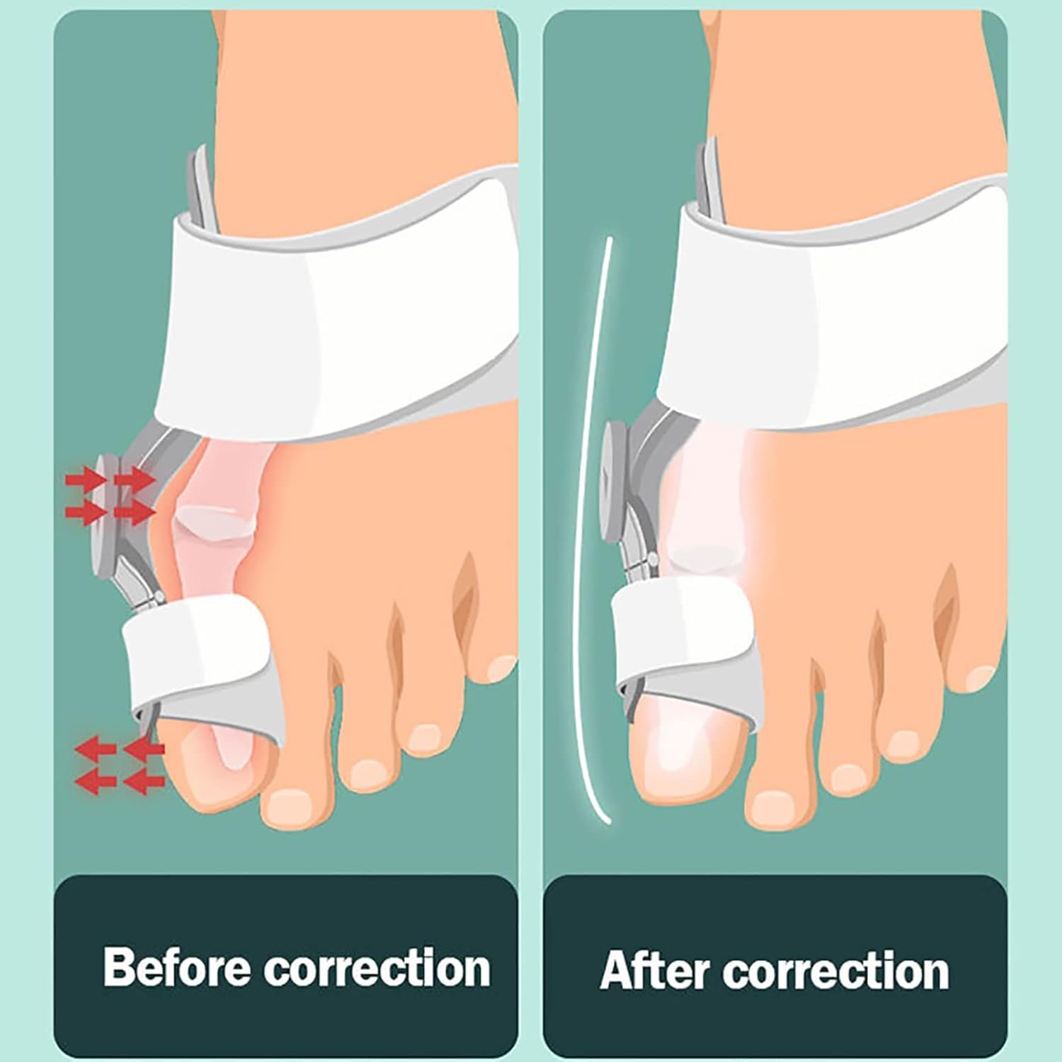 Bunion Orthosis fits the curvature of the valgus bone, and accurately adjusts the stretching force to achieve effective correction ● Features: 1. Thumb valgus correctionAdjust the degree of emission accordingly via the button. 2. Medical-Grade Bunion Splint Make the valgus angle smaller and restore the normal bone position. 3. Painless correction, silicone cushion, to protect the foot bones and avoid pain and foreign body sensation during the correction process. ● Specifications: Name: Thumb Valgus Corrector (Universal for left and right feet) Fixed bracket size: 144mm X 38mm X 27mm Net weight: about 67g Intended use: Used for external fixation or support of human feet. Material Composition: Fixing bracket: Polycarbonate Gel pad: Styrene butadiene rubber Front Strap:Polyamide Tail strap: polyamide Features:Plastic metal correction, strong, adjust strength, simple, direct and comfortable! 4 Steps to Wearing Orthotics: 1. Pull up the knob to loosen the cable, wear it and fit the silicone pad to the foot bone 2. Adjust the arch strap to fix the sole of the foot 3. Adjust the big toe strap 4. Adjust the knob to adjust the tension to an appropriate degree ● Packing list: Thumb valgus correction *1 piece/2 pieces ● Note: Due to different monitors and measurement methods, there may be errors in product color and size, please understand!