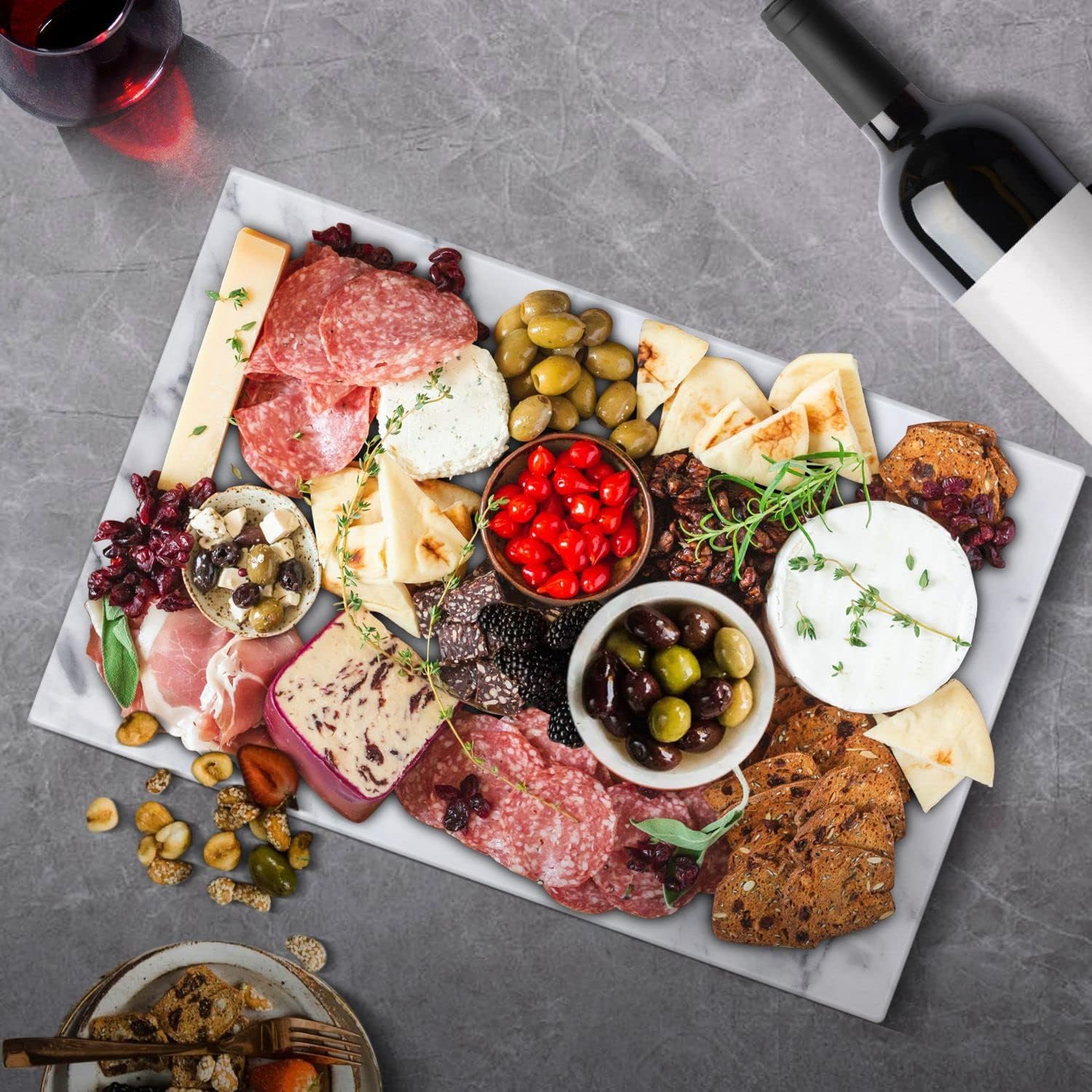 Serve your sweet and savory choice with our charcuterie board, and achieve an effortless presentation that brings everything together. Typically, a charcuterie board includes a variety of cured meats and cheeses, such as salami, prosciutto, Brie, and Gouda, in addition to additional small bites like hummus, jam, bread, honey, fruit, and edible flowers. The wonderful thing about a platter of ready-to-eat finger foods is that you can put one together without needing a lot of culinary expertise. However, it can take some experience to get the presentation just right. With our marble charcuterie board, you can show friends and family your charcuterie with a mouth-watering display and a touch of class. Each cheese board marble has a unique design because of the natural grains of marble, making each piece one-of-a-kind. The simple and beautiful design will look great on your table, coffee table, or countertop. This marble pastry board is easy to clean. When finished, you can wipe it with a damp towel or hand wash it with soap and water.Specification:Material: MarbleDimension: 11.5x15.3x0.6 inches (39x29x1.5CM)Weight: 11 lbs (5.5 kg)Package Content:1x Rectangular Marble Cheese Board - 11.5 x 15 Inch Gray Marble Serving Board for Baking, Charcuterie, Cheese, Cutting, Pastry, Trivet - Non-Stick and Heat Resistant Marble Board for Home Kitchen
