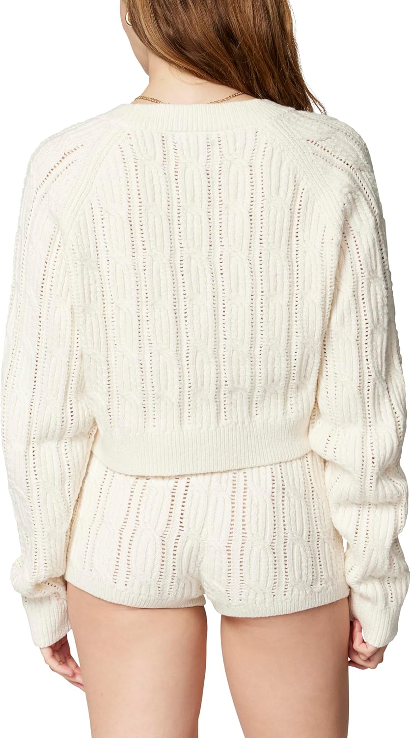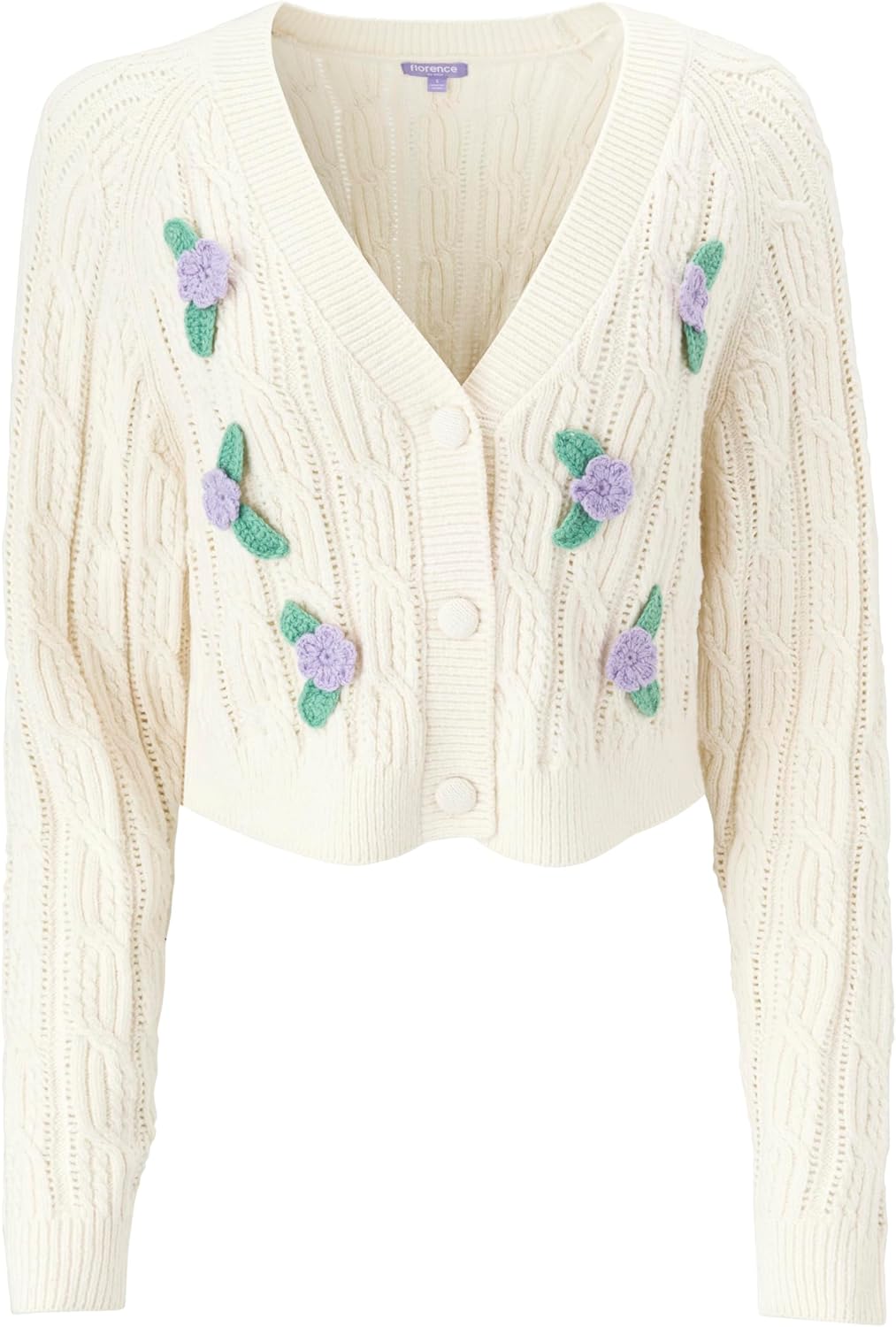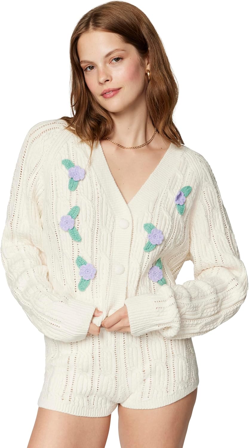 Fitted jacquard cable knit floral cardigan with hand crochet flowers and shank buttons at center front in Ballerina Pink. This fitted cardigan comes in the cable skit sweater that is stretchy. Features hand crochet flowers and shank buttons at the center front. Imported fabric; 53% Cotton, 35% Acrylic, 12% Polyester.
