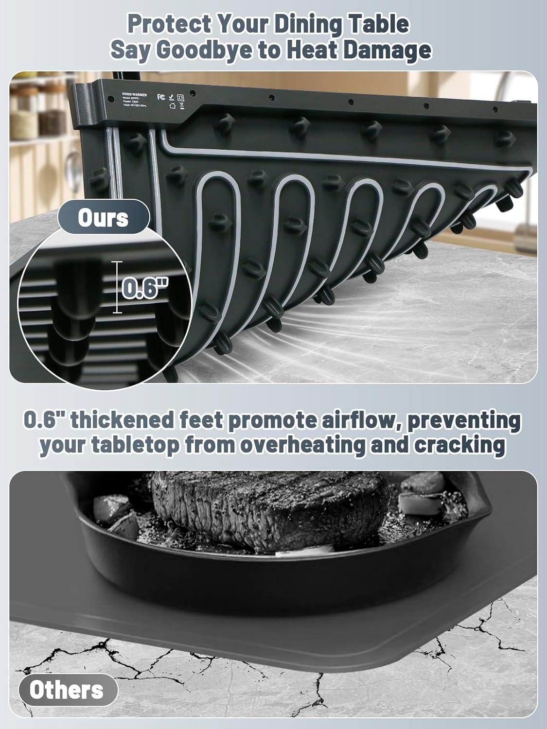 • 【Table Protection Design】Our food warming mat features supportive feet that elevate the heating wires 0.6 inches above your tabletop, promoting airflow and preventing overheating that could damage your surfaces. The non-slip design ensures it stays securely in place, protecting your beloved dining table from scratches. Enjoy the peace of mind that comes with both functionality and protection, allowing you to serve meals without worry while keeping your table safe and looking great.