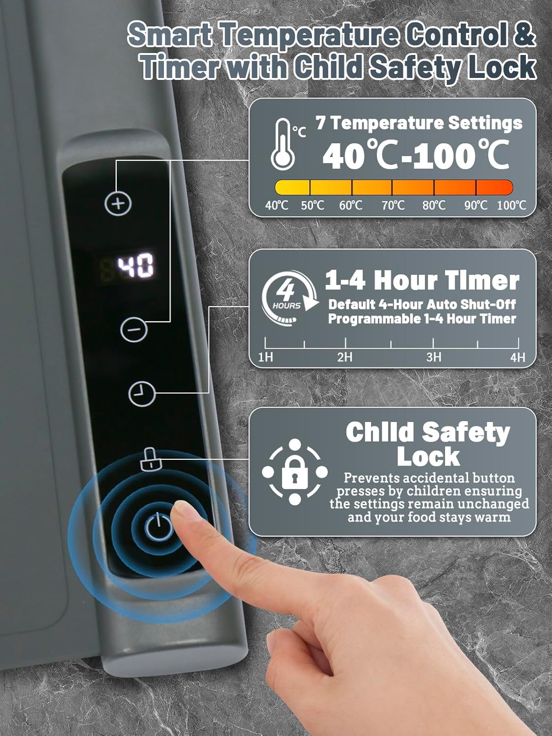 • 【Enhanced Safety Features】Prioritizing your family's safety, our food warmer includes a baby safety lock that secures the control panel, preventing little hands from changing settings. With an automatic shut-off after 4 hours, you can relax knowing it won't overheat if you forget to turn it off. Enjoy peace of mind with our mat, designed to operate safely around children while minimizing risks.