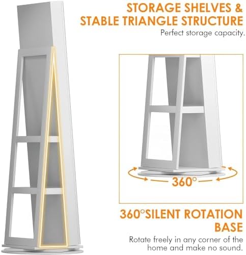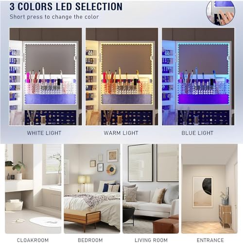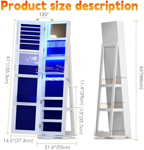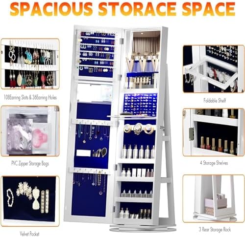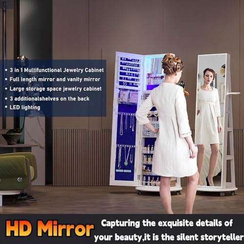 Introducing our versatile 3-in-1 free-standing jewelry cabinet, an essential addition to your dressing area. This multifunctional piece combines a sleek jewelry armoire, a full-length mirror, and practical storage shelves, making it perfect for anyone who loves to accessorize. Crafted from high-density MDF, this jewelry mirror cabinet features a premium surface finish that exudes elegance and durability. With moisture-proof, corrosion-resistant, and wear-resistant properties, it outshines lower-quality cabinets on the market. As you open the cabinet, an automatic LED warm light illuminates your collection, creating a luxurious ambiance (batteries not included). This innovative design ensures you can easily find and appreciate your jewelry, enhancing your daily routine. The cabinet offers generous storage solutions, including 108 earring slots, 96 ring grooves, and 24 necklace hooks, along with various compartments to keep your treasures organized and easily accessible. Equipped with a frameless full-size mirror measuring 61 inches by 14.6 inches, this cabinet provides a clear and true reflection for your complete look. The built-in high-definition cosmetic mirror is perfect for selecting accessories or applying makeup. The 360-degree rotation feature allows for effortless access to all your items, while the stable round base enhances stability. Plus, the secure lock design with a key keeps your jewelry safe from curious hands. Elevate your space with this stylish jewelry cabinet, combining functionality and elegance, and enjoy the convenience it brings to your daily dressing routine.