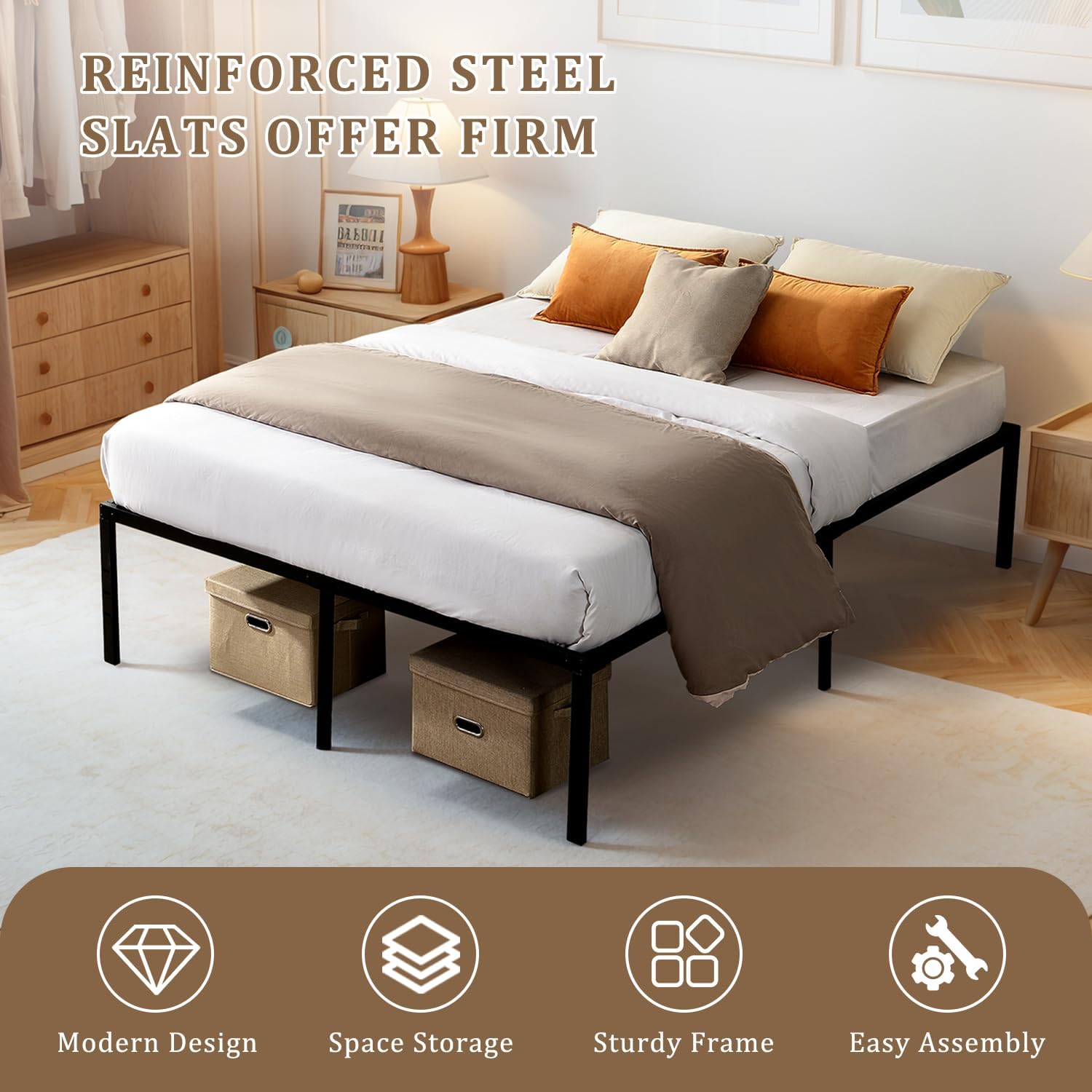 Transform your bedroom into a modern oasis with our expertly crafted Bed Frame, designed to deliver exceptional durability and comfort. This heavy-duty metal bed frame serves as a robust mattress foundation, eliminating the need for a traditional box spring and providing you with a hassle-free sleeping experience. Engineered from premium steel, it supports up to 1,000 pounds of static pressure, ensuring unparalleled stability without any squeaking or shaking.Maximize your space with ease thanks to the generous 15-inch under-bed storage clearance. This ideal height allows for effortless organization of bins, luggage, or seasonal items, helping you maintain a clutter-free environment. The sleek black finish of this platform bed frame seamlessly complements various décor styles, from industrial lofts to contemporary apartments.Assembly is a breeze with our quick-assembly design, while reinforced legs and noise-free construction guarantee peaceful nights of sleep. Whether you’re in need of a queen bed frame or a heavy-duty king size metal bed frame, our platform bed frames are the perfect choice for enhancing your bedroom's functionality and aesthetics.Key Features:- Supports up to 1,000 pounds of static pressure without deformation- No box spring needed for added convenience- Minimalist black finish suiting various styles- 15-inch under-bed storage clearance for optimal organization- Quick-assembly design for hassle-free setup- Noise-free construction for uninterrupted sleepElevate your sleeping experience with our versatile metal bed frame, ideal for anyone seeking a stylish, reliable, and low-profile solution for their mattress needs.