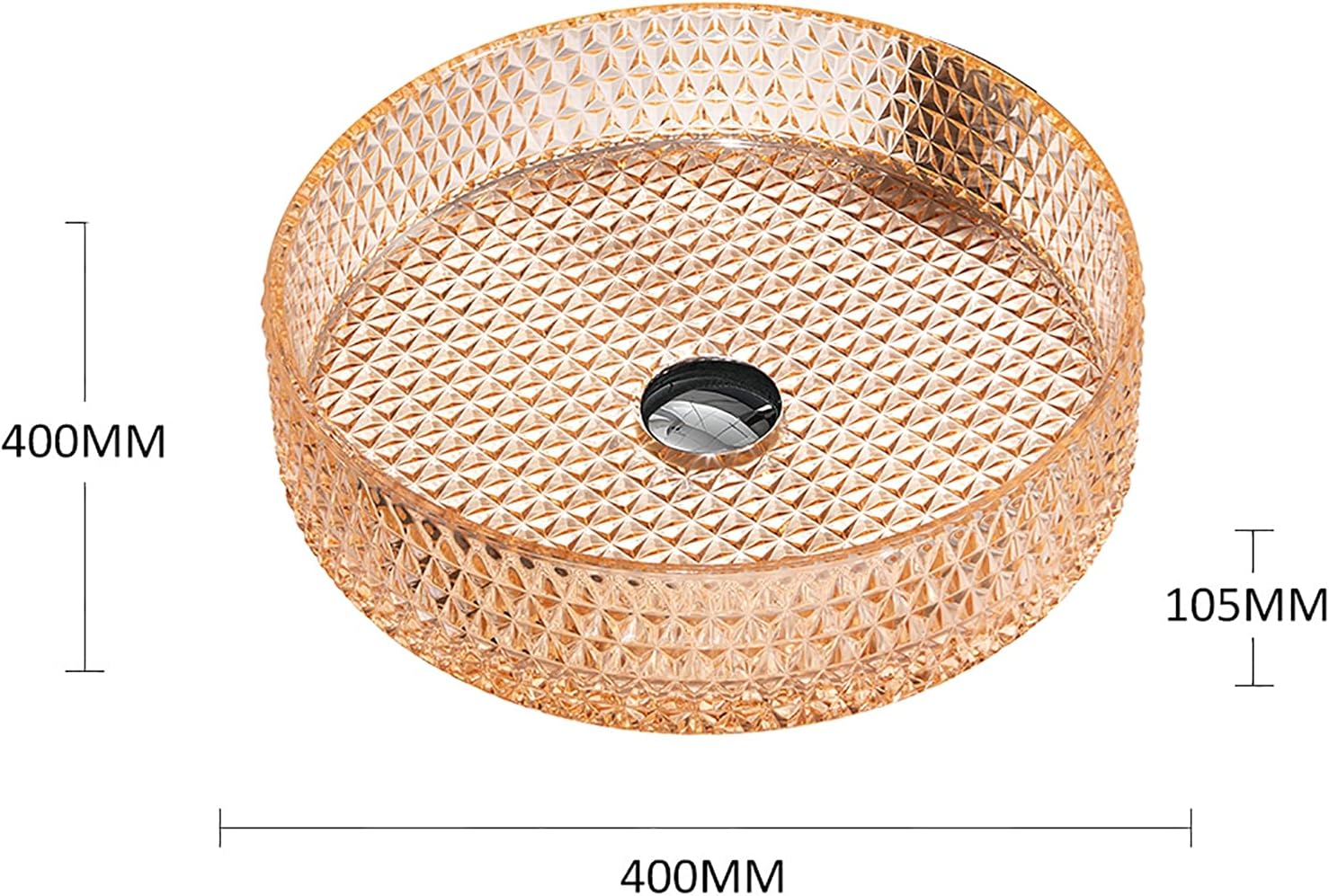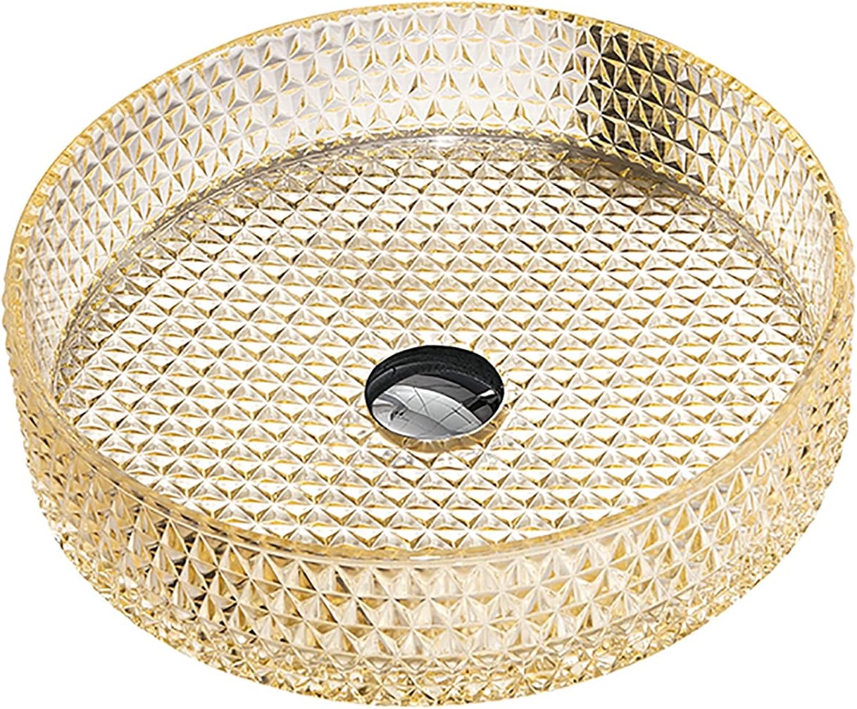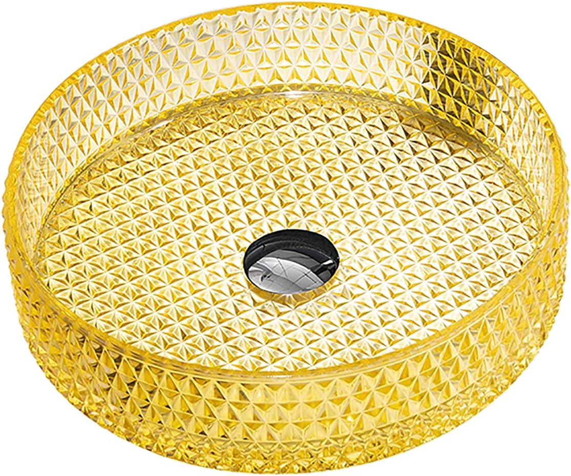 The vessel sink is formed using tempered deco glass material. Chic colors and classic style. Suitable for any style of bathroomSpecification:Product Name: Bathroom Vessel SinkStyle: ContemporaryShape: CylindricalColor: Clear/ Gold/ Orange/ YellowInstallation: Countertop InstallationSink Dimension: Length 400mm * width 400mm * height 105mmGlass Thickness: 0.5" (12mm)Drain Hole: 45 mmMaterial:Basin Material: GlassPackage Includes: 1× Single Vessel Sink1× Brass pop up drain1× Odor proof down pipe1× Alloy mounting ringWarm Tips★ Items may slightly differ from photo in terms of color due to the lighting or your monitor's display.★ Contact us when meeting difficulties on installation or any other problems. Your email will be replied within 24 hours.● Applicable Places:Villa Bathroom, Private Club Bathroom, Hotel Bathroom, Club Bathroom, Family Bathroom and so on