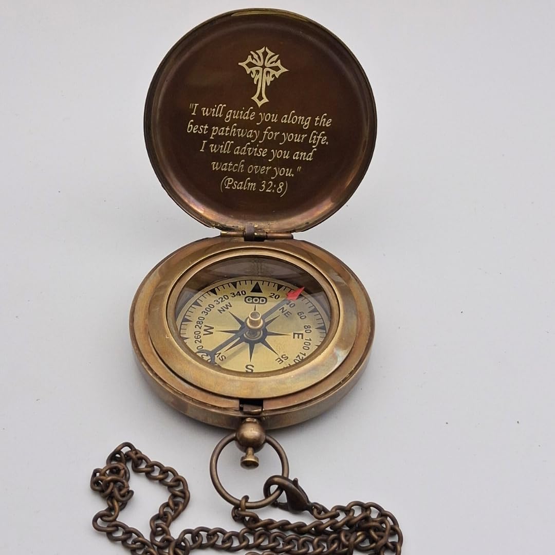 Celebrate faith, direction, and purpose with this beautifully crafted God’s Guidance Engraved Brass Pocket Compass, featuring the inspiring Bible verse Psalm 32:8: “I will guide you along the best pathway for your life. I will advise you and watch over you.” Designed with a timeless antique finish, this solid brass compass symbolizes spiritual guidance and life’s journey. The detailed engraving inside the lid makes it a meaningful Christian keepsake that offers daily encouragement and reassurance. With an approximate 3-inch diameter, this pocket compass is compact, portable, and easy to carry for travel, hiking, camping, outdoor adventures, or elegant desk display. It is fully functional while also serving as a powerful symbol of faith. The compass includes a sturdy chain and makes a thoughtful Christian graduation gift, baptism gift, confirmation gift, birthday gift, Father’s Day gift, Easter gift, or religious keepsake for men and women. Whether for a son, daughter, husband, friend, or loved one, this scripture compass is a reminder that God’s guidance is always present. Perfect for: Graduation celebrations Baptism & Confirmation Religious milestones Spiritual encouragement gifts Faith-based keepsakes Give a gift that represents trust, faith, and divine direction.