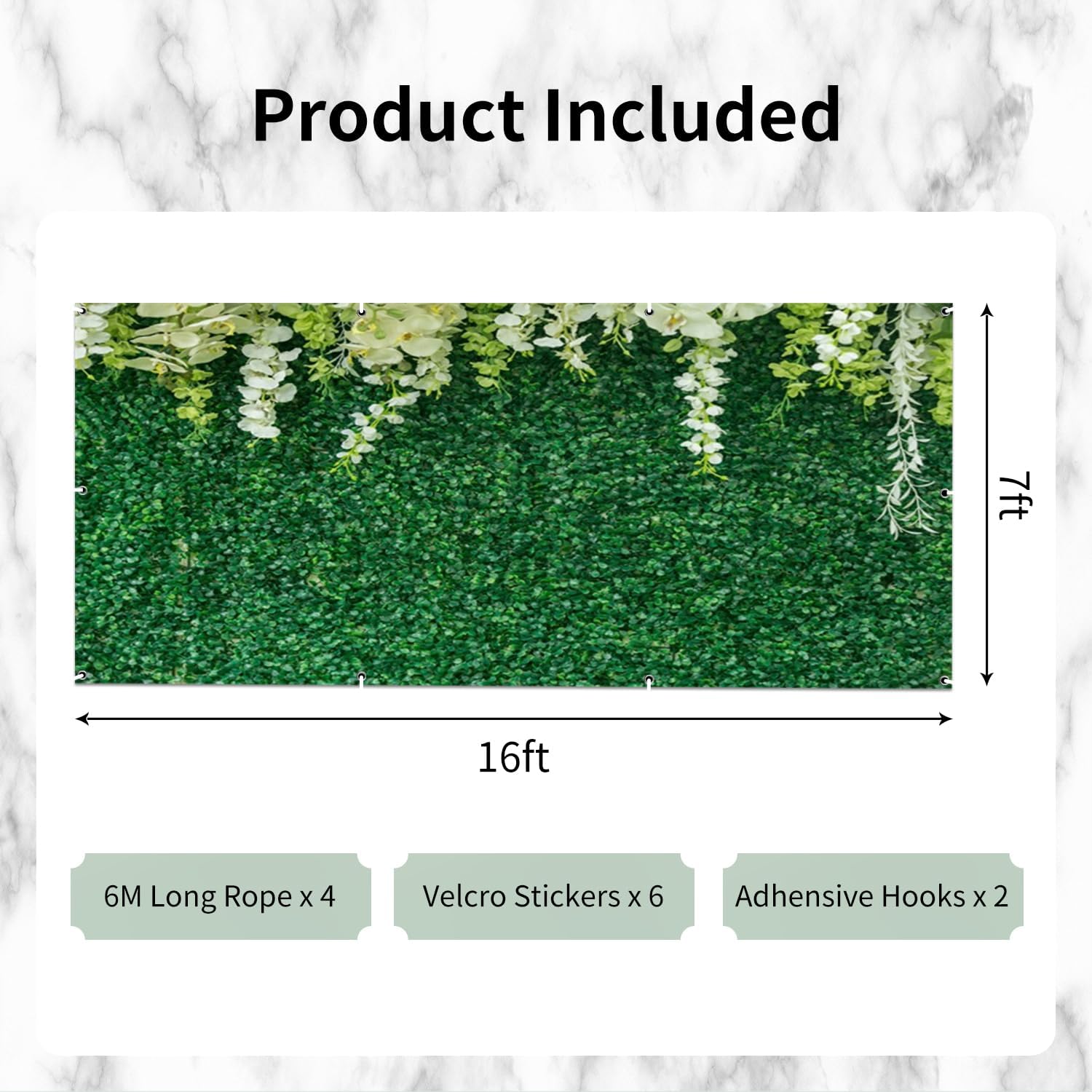 Package Contains: 1 garage door cover, 4 ropes long 6m, 6 pairs velcro stickers and 2 adhesive hooks, which will be convenient for you to hang in various places.Product Material: PolyesterProduct Features: 1.Waterproof, durable, sturdy, foldable and easy to store.2.Multi-situation. It's not just for garage, it's also the backdrop for a home or school party, an indoor or outdoor decoration.Tips1.Manual measurement, please allow slight errors on size and the color may exist a slight difference due to different screen displays.2.The product needs to be folded for packing and shipping. So there will be some slight creases on it. The creases will be removed easily by ironing the side without pattern.3.Adhesive hooks and velcro stickers are not recommended to reuse and cannot be used at high temperatures.4.Use a rag to clean the hook and Velcro paste parts. Ensure that the paste area is dry and clean.
