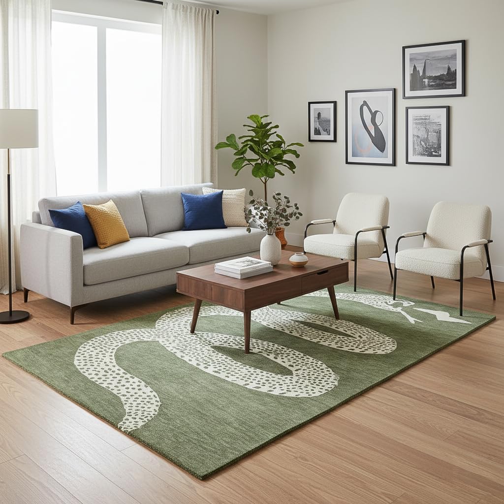 Enhance Your Home with the Luxurious Hand-Tufted Wool Snake Pattern RugTransform your living space with our exquisite Hand-Tufted Wool Rug, featuring a stunning snake pattern in a soft pink hue. Expertly crafted from 100% natural wool, this rug combines unparalleled softness with robust durability, making it an ideal choice for high-traffic areas in your home.Key Features:100% Pure Wool Material: Experience the ultimate in comfort and durability with our rug made from 100% natural wool. The soft yet sturdy fibers ensure long-lasting beauty and resilience, perfect for everyday use.Unique Snake Design: Add a touch of modern elegance to any room with the eye-catching snake pattern. The soft pink color complements a variety of decor styles, from contemporary to classic.Hand-Tufted Craftsmanship: Each rug is meticulously hand-tufted by skilled artisans in India, resulting in a dense, luxurious pile that enhances both the look and feel of your space.Plush Comfort: The high pile height provides a plush, cushioned surface that feels incredible underfoot. Perfect for lounging and adding an extra layer of insulation to your floors.Durable Cotton Backing: Designed with a cotton backing reinforced with natural latex, our rug ensures a non-slip grip and added durability, making it a reliable choice for any room.Versatile Decor Fit: Whether in your living room, bedroom, kitchen, or office, this rug seamlessly integrates with both modern and classic decor. Its transitional style enhances any area with a touch of elegance and wild charm.Easy Maintenance: Keep your rug looking pristine with minimal effort. Simply vacuum regularly to remove dirt and debris, and blot spills immediately with a clean cloth to prevent staining.Why Choose Our Hand-Tufted Wool Snake Pattern Rug?Our rug is more than just a decorative piece; it’s a statement of style and quality. The combination of natural wool, expert craftsmanship, and unique design ensures that this rug will be a cherished addition to your home for years to come. Whether you're updating your decor or creating a new look, our Hand-Tufted Wool Rug is the perfect choice to elevate your space.