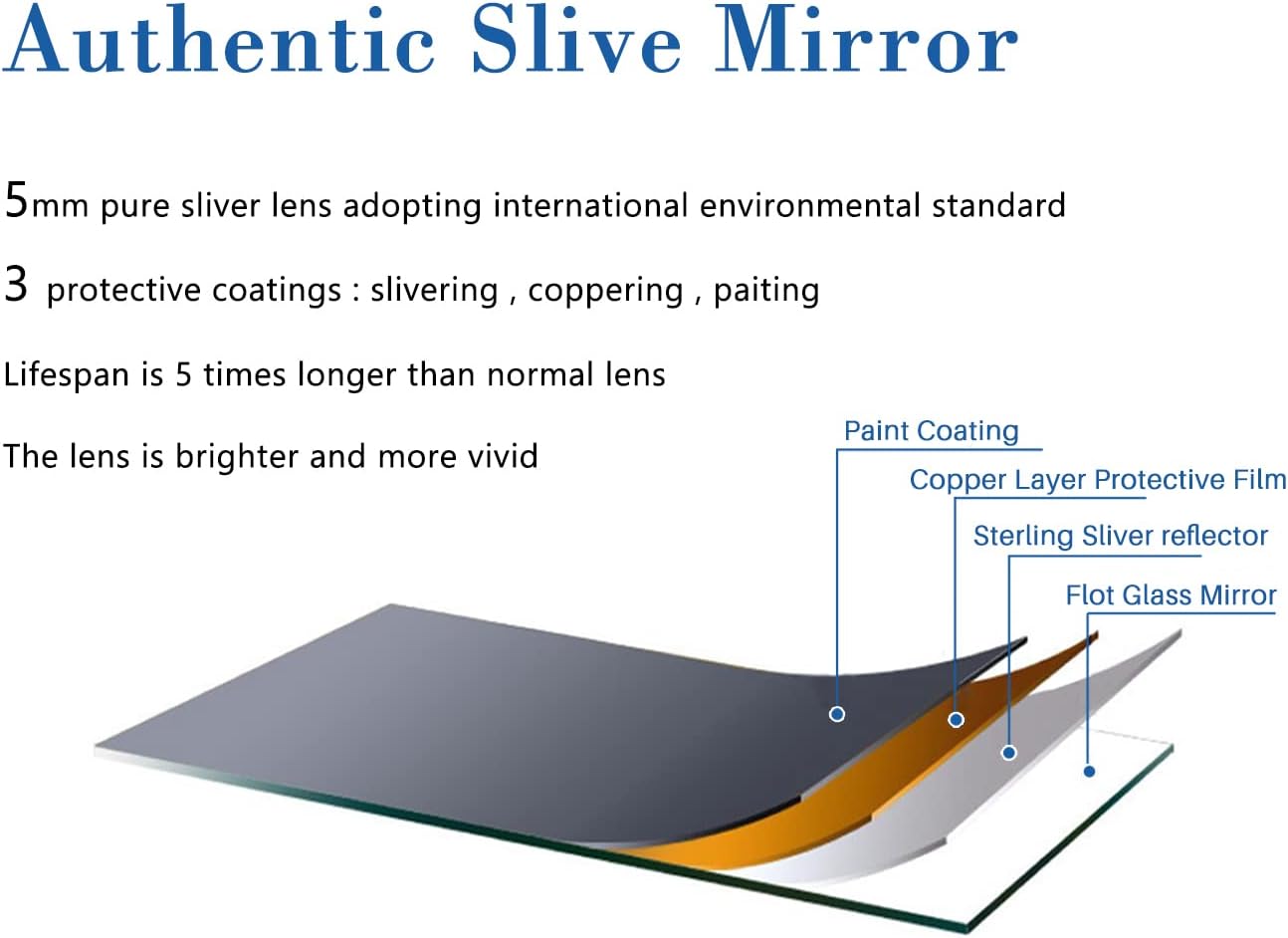 Accurate Reflection Outer size: 40-in by 24-in Triple coated silver backed mirror with CAT 1 Vinyl backing to secure glass in the event of an accident. Adjustable mounting system which allows quick installation horizontal or vertical, hardware and screws included. Commercial grade vanity or bathroom hanging rectangle vertical mirror. Order our Hans&Alice mirror and see for yourself. If you don't absolutely love our product, let us know and receive a full, no questions asked refund.