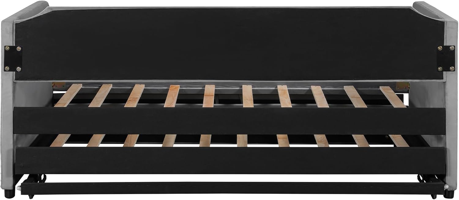 This double upholstered daybed with a pull-out bed creates a comfortable and flexible sleeping space. The soft velvet fabric adds a warm and cozy atmosphere to any bedroom, guest room, or children's room. During the day, it serves as a comfortable sofa for reading or relaxation. At night, simply pull out the pull-out bed to match the bed height, providing an instant sleep solution for overnight guests, siblings, or visiting guests. Overall Product Dimension:81"L x 44"W x 35.5"H Overall Product Weight:143.42LBS Weight Capacity:400lbs Product Type:Daybed Size:Twin Color:Beige/Gray/Pink Material:Upholstered+Plywood Number of Slats:10+10 Assembly Required:Yes Country of Origin:Vietnam