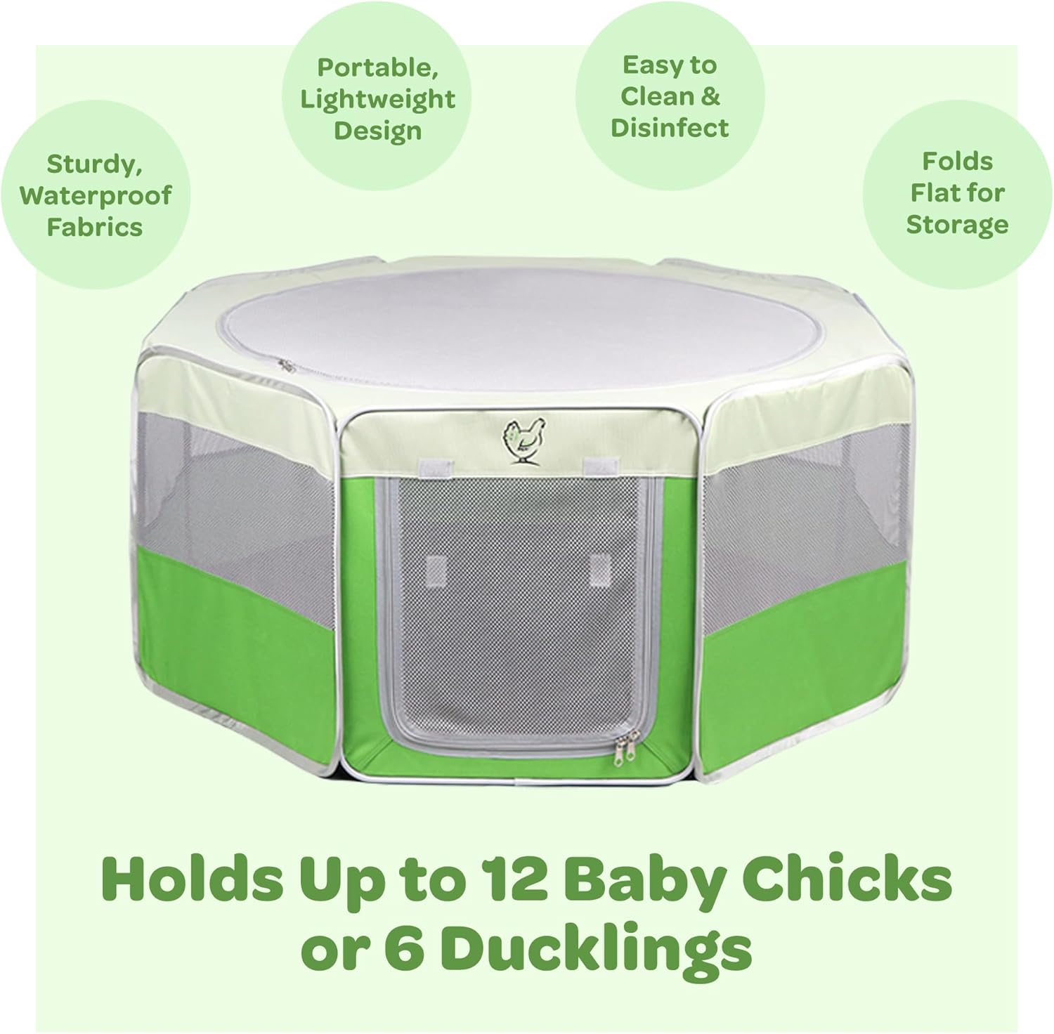 The Hen Pen Pop-Up Brooder has been meticulously designed and is exclusive to My Pet Chicken. We tested and designed this premium enclosure to solve the most common issues for those of you who raise baby chicks and small animals.Our premium brooder is made of thick, strong material, and it's fully enclosable to keep animals safe from mischievous hands and paws.No more jailbreaks. After two to three weeks, chicks are often able to escape traditional brooders, and you can guess what happens then: poop (so much poop!) where you don't want it, and the possibility for animals to be injured or worse.No more mess. While we encourage you to put down a layer of plastic under your brooder *just in case*, or to place it on a waterproof surface, our extensive testing has shown this brooder to be waterproof. You won't have to worry about water spills, or about bedding being kicked all over the place.No corners for chicks to get trapped in. Corners are no bueno when it comes to raising chicks! They huddle when frightened, and tragedy can sometimes befall the ones stuck in the corner. Our octagon design ensures their safety.No more waste. You can use this brooder year after year, hatch after hatch. We carefully designed and tested this to stand the test of time.Cleaning and storage: Wipe down the brooder with damp paper towels and allow it to completely dry before folding up for storage to avoid mildew and mold. Once dry simply collapse and fold into storage bag.