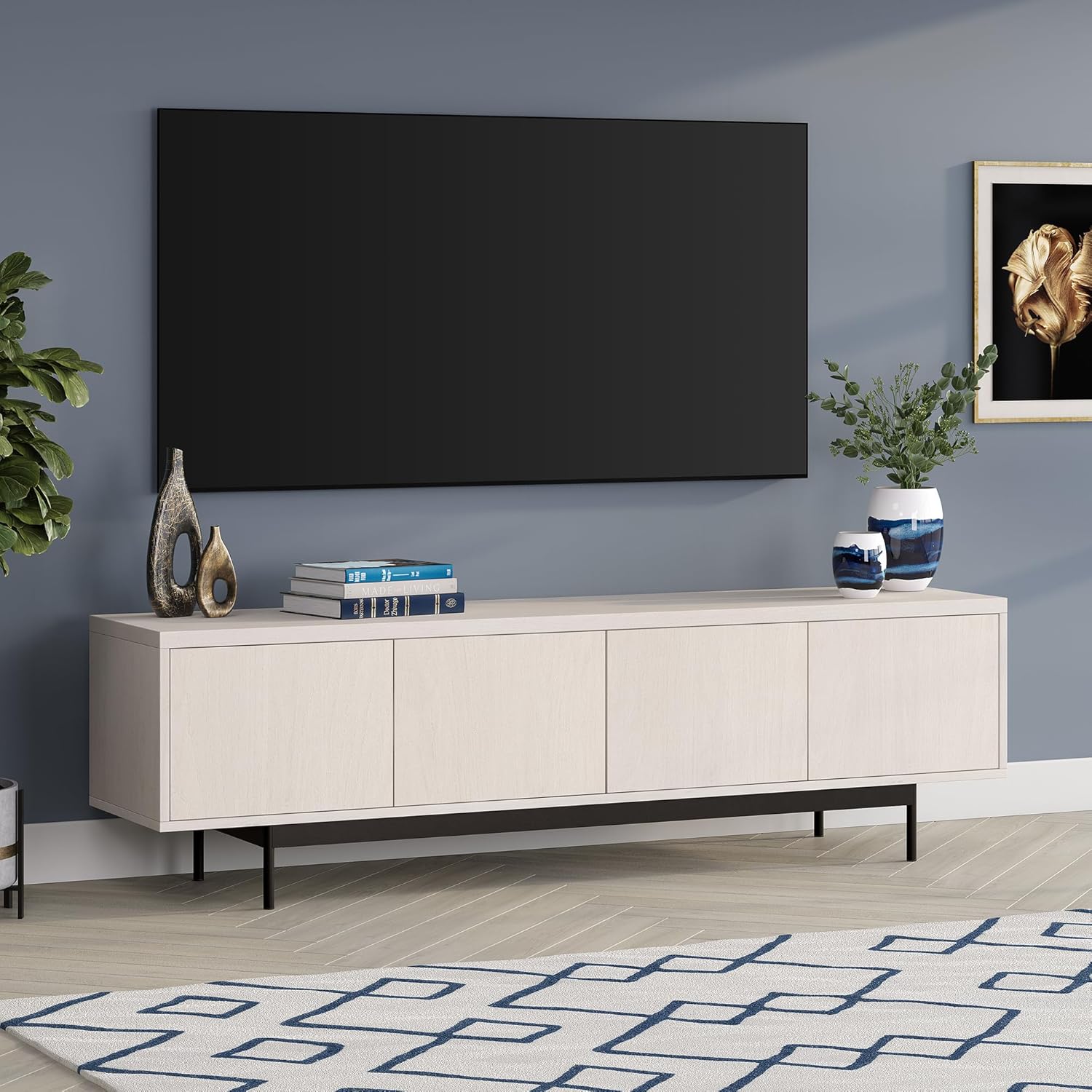 On-trend mixed material design is on display with modern TV stand. With a wood grain finish and sleek hardware-free doors, this piece is perfect for your mid-century or minimalist-inspired living room, den, or game room. It's low 20" height leaves plenty of room above for an oversized wall-mounted TV or set of statement lamps. This stand features cable-management cut-outs and 4 fully enclosed doors with an open inside area, allowing for free-form storage of your devices, games, books, and more.