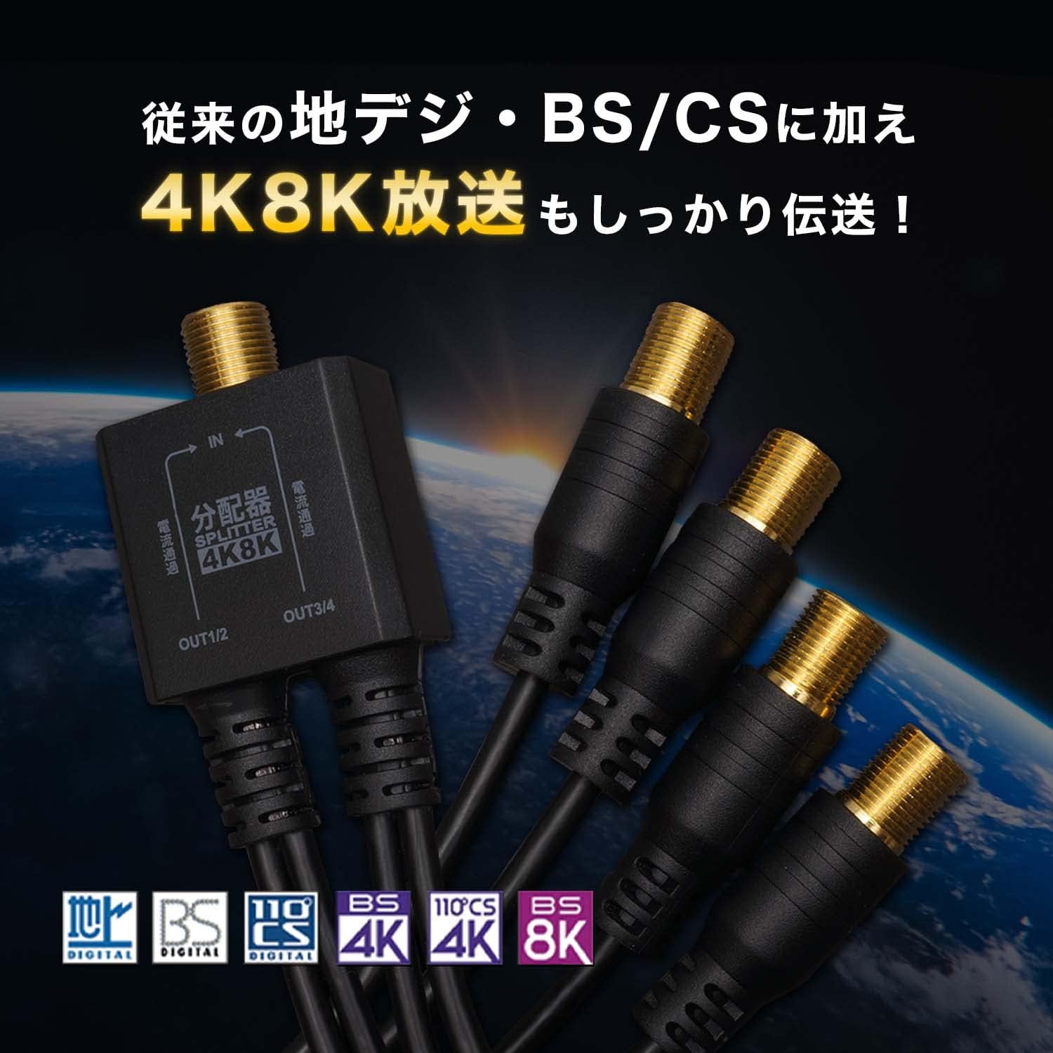 ■ When you want to separate signals from multiple devices. Efficiently distributes one antenna signal. By using this product, you can send signals distributed to 4 devices, such as peripheral devices such as recorders and TVs in separate rooms. ■Compatible with new 4K8K satellite broadcast In addition to traditional terrestrial digit, BS, 110 degree CS broadcast, it also supports the latest 4K/8K broadcast. ■ Lightweight and compact design Uses an integrated cable structure with an F type connection connector, which makes the case lighter and more compact than standard 4 splitters. Can be used with similar size to a waveboard or 2 splitter - All terminals BS antenna power supply available. Requires an input antenna cable (sold separately).