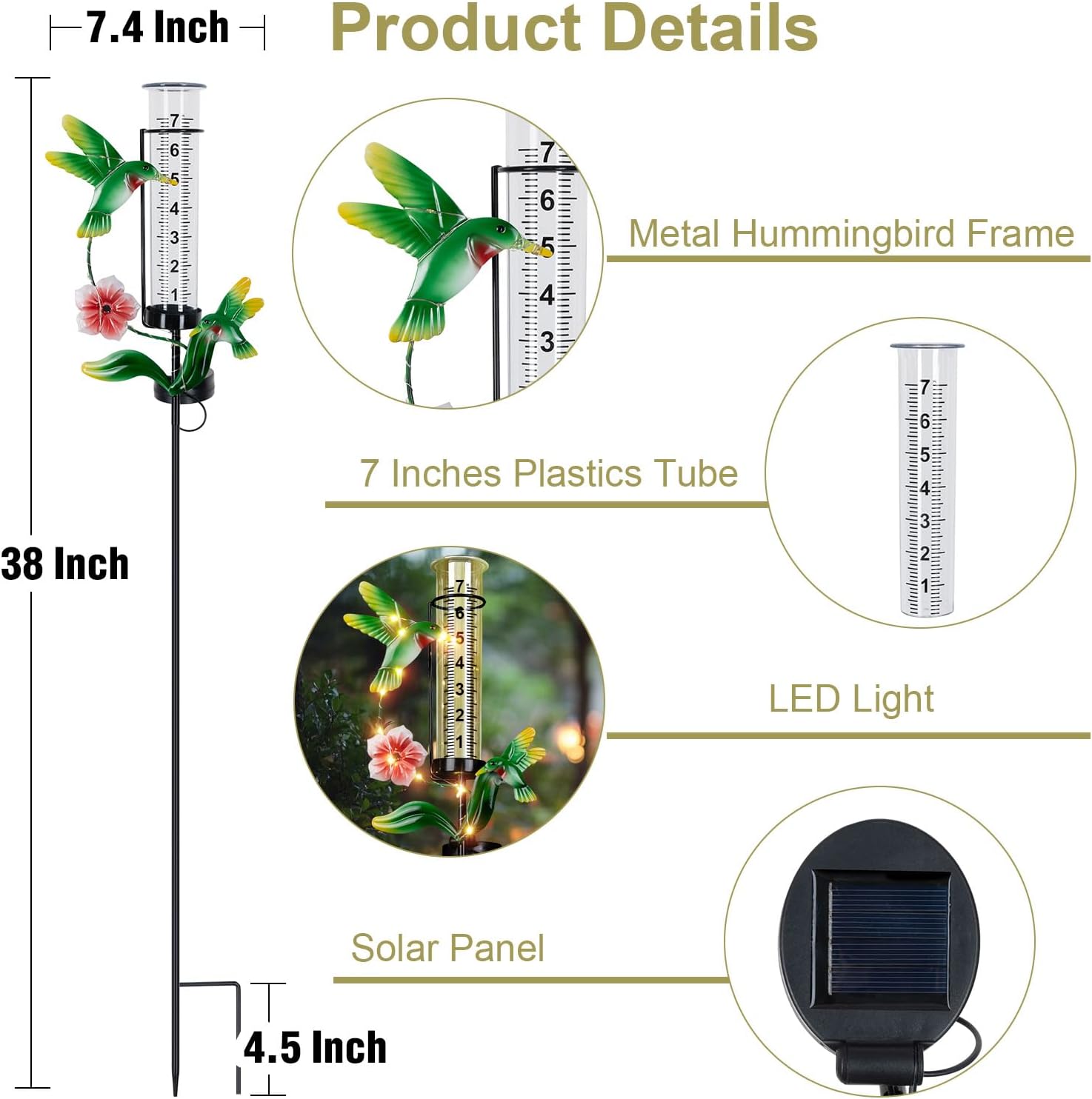 Introducing our Hummingbird Wind Spinner and Rain Gauge Bundle, the perfect addition to elevate your garden's appeal! This combo includes a stunning wind spinner adorned with lights hummingbird and flower patterns, and a functional rain gauge decorated with matching accents. Crafted from premium materials, both pieces are built to endure outdoor elements, ensuring durability and style season after season. The wind spinner dances elegantly in the wind, bringing life and motion to your yard, while the rain gauge helps you track precipitation for smarter gardening. Ideal for gifting or personal use, this bundle effortlessly blends aesthetics with utility. Transform your outdoor area into a charming oasis today!