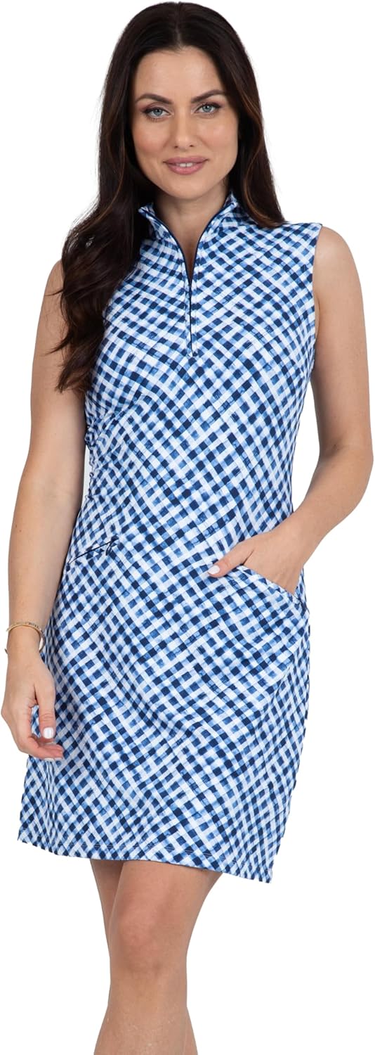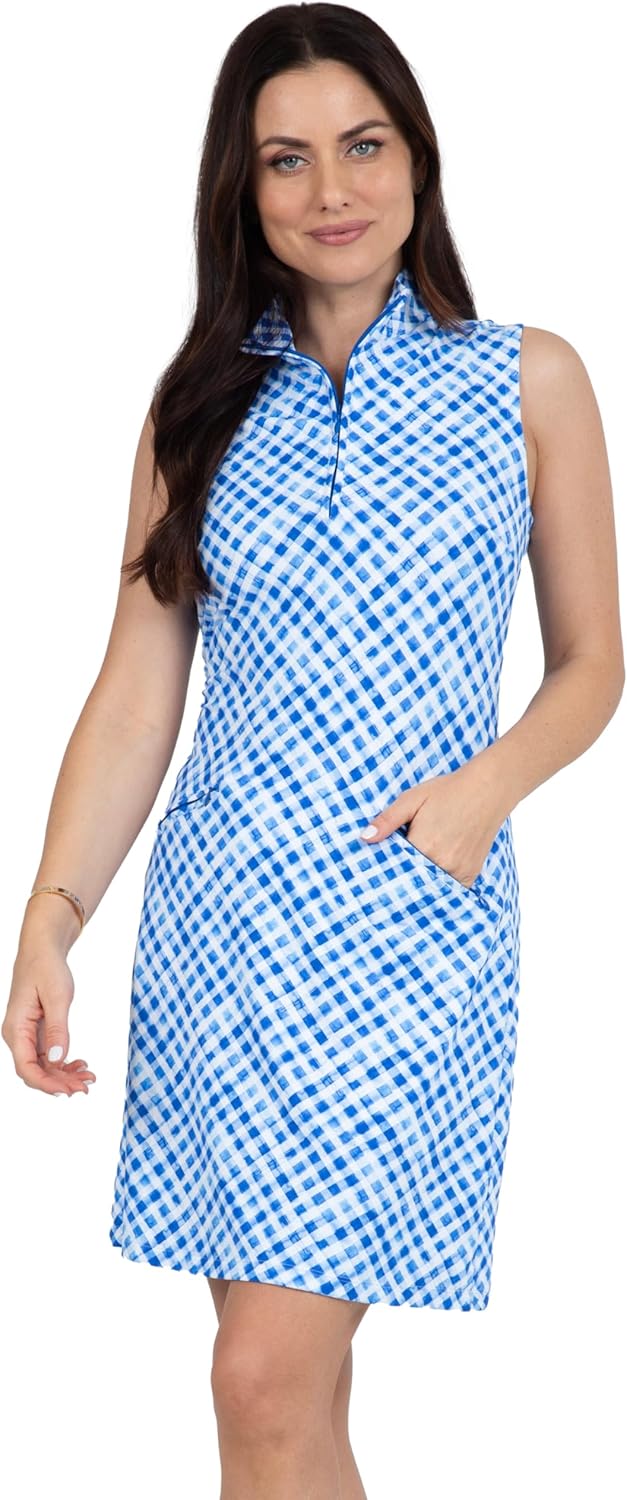 Transition seamlessly from the court to the clubhouse in this charming Sleeveless Zip Mock Neck Dress with pockets positioned at just the right angle for phone and tees storage. Made in all-new dynamic prints and our patented Icefil technology that interacts with your perspiration to lower your temperature by five degrees so you can keep cool on even the warmest days. The soft, lightweight, and UPF 50+ fabric keeps you protected and looking vibrant all day long.