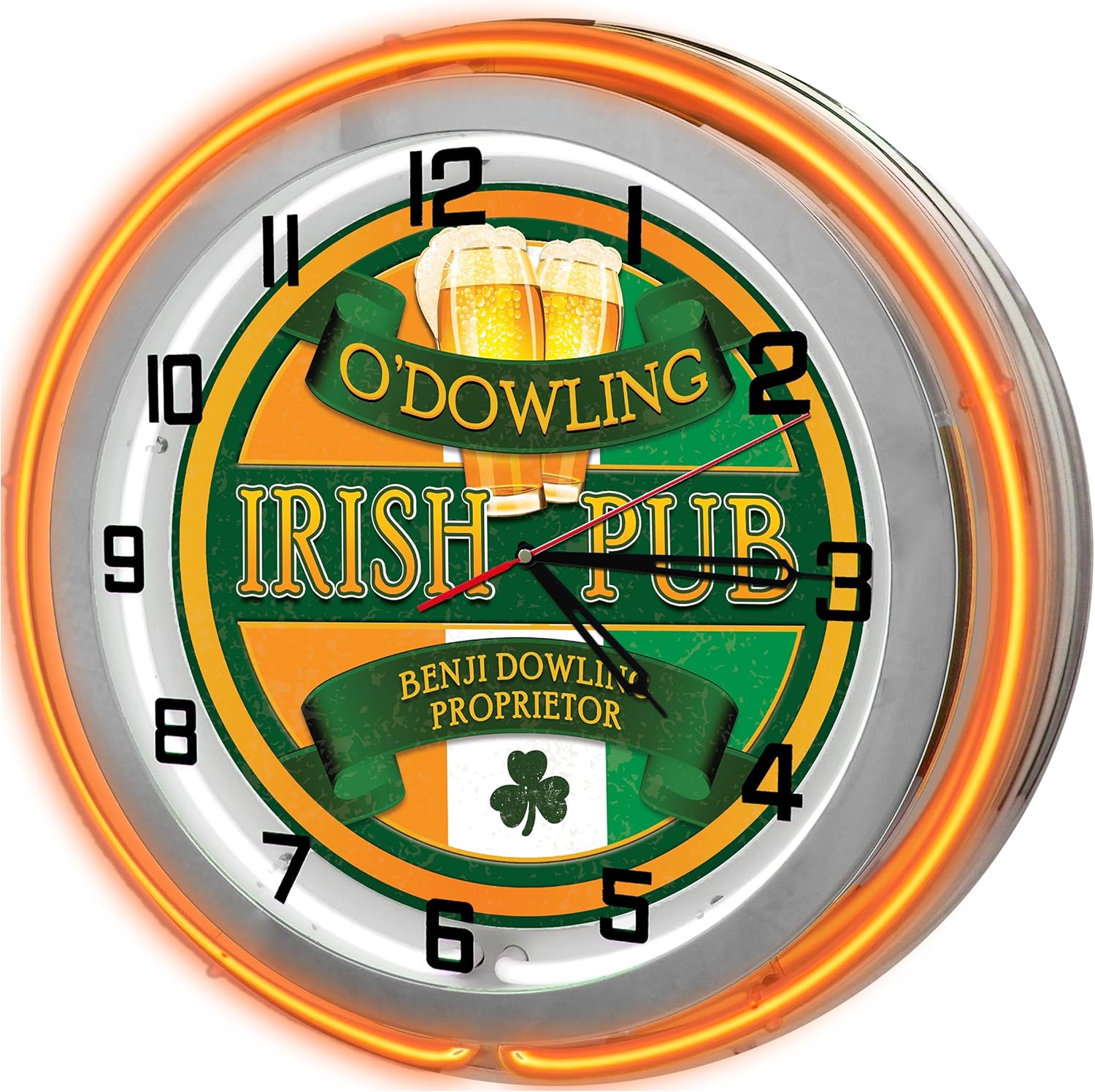 This brand new ready-to-hang neon clock makes a perfect addition to any garage, bar, game room or man cave! Clocks are lit with two double neon tubes, one color for the outside and one bright white on the inside. Clock motor contains a high-precision quartz movement and sweep technology making it smooth and quiet with no "tick-tock" noise. Inside image is a printed high quality graphic which can have words added to it upon request. Have an image or business logo you'd like to add to the clock? We can do customizing upon request. Whether you want a gift with a "wow factor" or compliment your own home/shop, our neon clocks will impress!