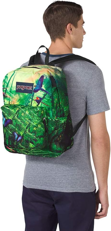 Discover the JanSport High Stakes Wild Jungle One Size backpack, a stylish and functional choice for your school days. This unisex daypack features a spacious 17-liter capacity, perfect for carrying your essentials. Measuring 13x16.7 inches, it's designed to accommodate up to a 13-inch laptop. The durable nylon shell and polyester lining ensure longevity, while the water-resistant finish protects your belongings from light rain. The backpack boasts a modern, tropical style with a vibrant Wild Jungle pattern, embellished with embroidered jungle-themed details. It's equipped with a convenient utility pocket and a cord design for added flair. The backpack is easy to carry with its comfortable shoulder straps and secure zipper closure. For care, hand wash only. Ideal for high school students, this backpack is compatible with devices up to 13 inches and is recommended for school use.
