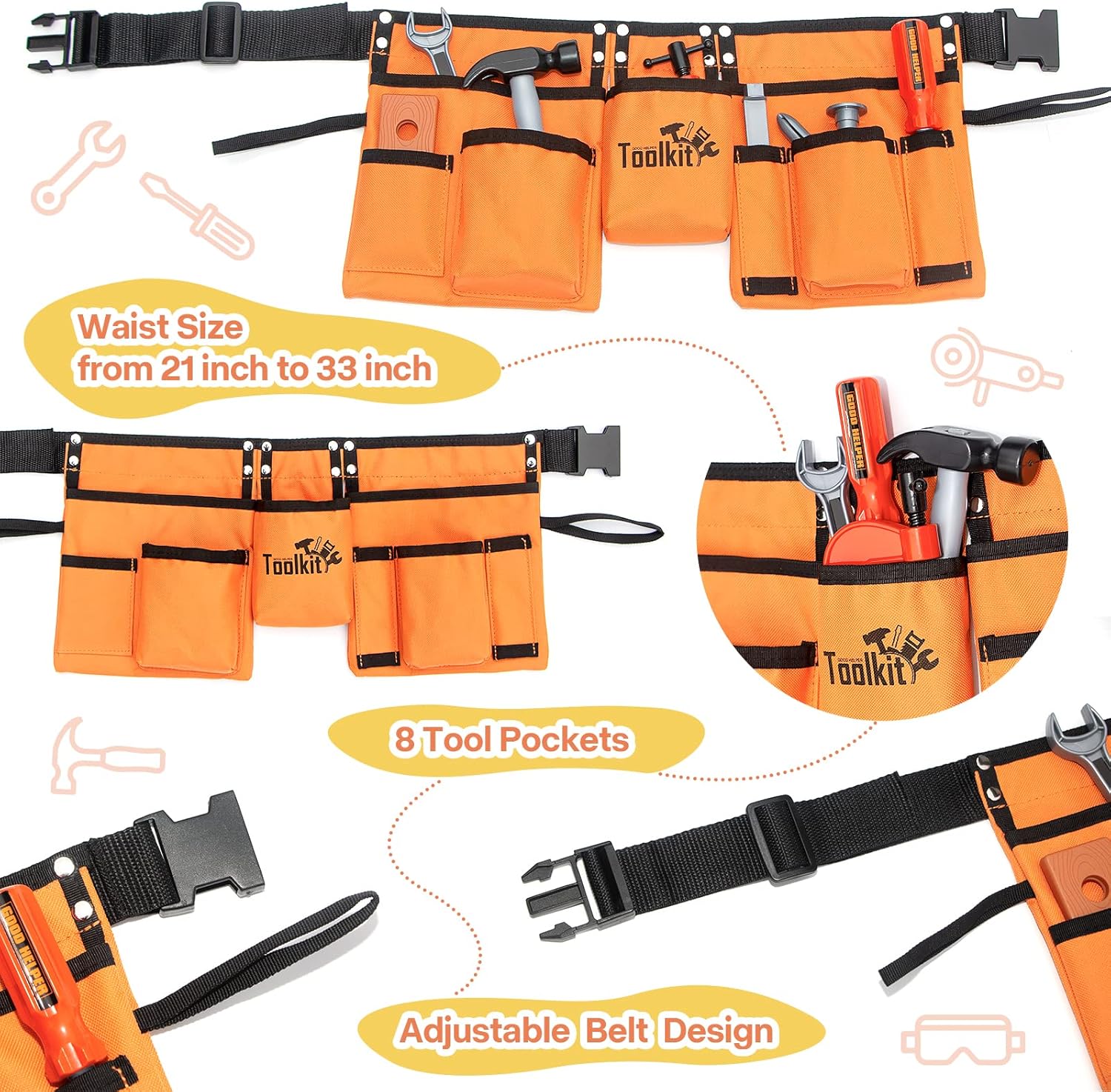 Super Value: Just like Daddy’s toolkit, this 48 pcs kids construction set includes everything you need! Our Unique Construction tools for kids includes a handled tool kit, an electric drill (batteries not included), realistic hammer, screwdrivers, goggle, protective mask and knife toy and a variety of wooden pieces, nails, nuts and more! Everything is fully functional and realistic. Durable & Safe Material: this kid tool set is made of premium ABS plastic, safe harmless to humans. Also, it makes our toys greater stiffness to increase robustness. No sharp parts will hurt children. All of these tools have been created to be a perfect size, rounded edges and smooth surface for your child’s smaller hands to handle. New Version 34pcs Kids Tool Set: To introduce more daily use tools to the kids, we develop a new version of child tool set to our pretend play toy tool set family! Our Unique Construction tools for kids includes angle grinder, circular saw, googles, respirator, C clamp, safety cap, hammer, screwdrivers, and a variety of wooden pieces, nails, nuts and more! Everything is fully functional and realistic. High-Quality Big Range Adjustable Kids Tool Belt For Easy Storage: Made of high quality Oxford Fabric, our kids tool belt with 8 pockets create plenty of space for tools, adjustable belt is suitable for waist 21 inch to 33 inch. The whole set tools could be placed into this toddler tool belt for easy storage Educational Pretend Tool Toy: This tool set for kids could keep your little one away from Daddy’s dangerous tool box, but give chance for them to feel excited about being a small repairman to satisfy child’s natural curiosity. They can learn how to use variety of tools and how to protect themselves when using tools.