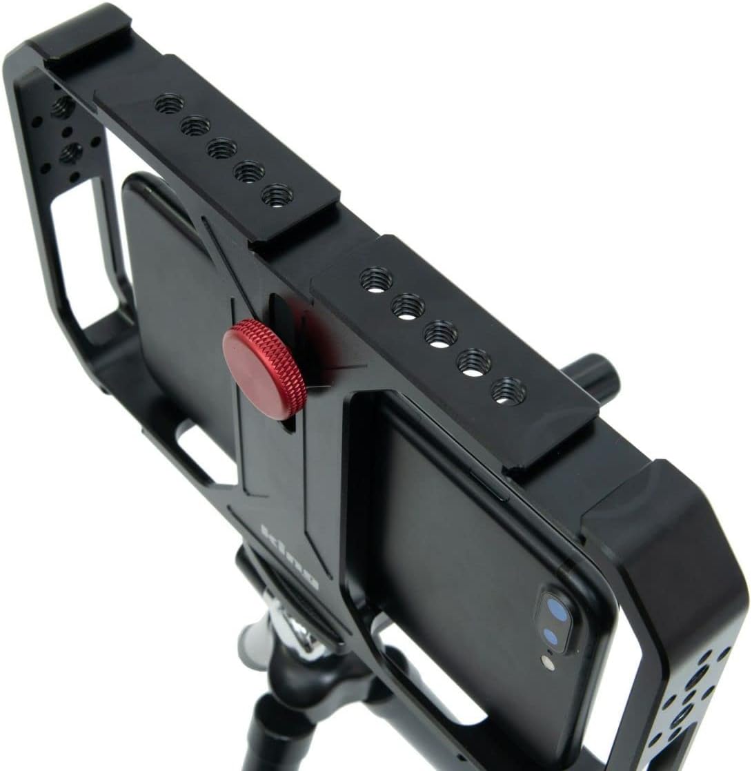 The KING MPC6080 is a convenient smartphone rig for attaching various accessories such as microphones and LED lights to your smartphone. The ARRI accessory mount is also compatible with ARRI standard positioning pins. When taking handheld shots, holding the frame side for improved holding and reducing shaking. There is a 1/4" screw hole on the bottom, so it can be mounted on a tripod. The cage is also made of aluminum to protect your phone from accidental drops and shocks. Easy to use. Simply clip your smartphone to the holder and tighten the lock screw to secure it. Product Size: 4.6 x 8.2 x 0.9 inches (118 x 208 x 23Weight: 8.3 oz (238 g). Material: Aluminum Smartphone mounting width: 2.4 - 3.1 inches (60 - 80 mm) Accessory attachment part: 1/4 camera screws: 13 places, 1/4 camera screws (with ARRI positioning pins); 4 places, cold shoes... 5 places.